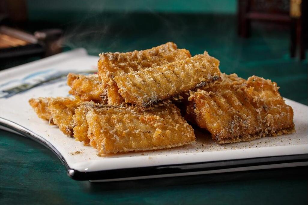 5、燒熱後把帶魚一塊一塊下進去,小火開始炸,炸到兩面金黃、外殼定型就可以出鍋了。接下來將鍋中的油溫再次燒熱,燒熱到冒煙以後,把帶魚重新下進去,保持大火復炸30秒鐘,馬上撈出來開喫。帶魚要復炸一次,這樣纔可以更加酥脆,涼了不回軟,這是第2個要點。