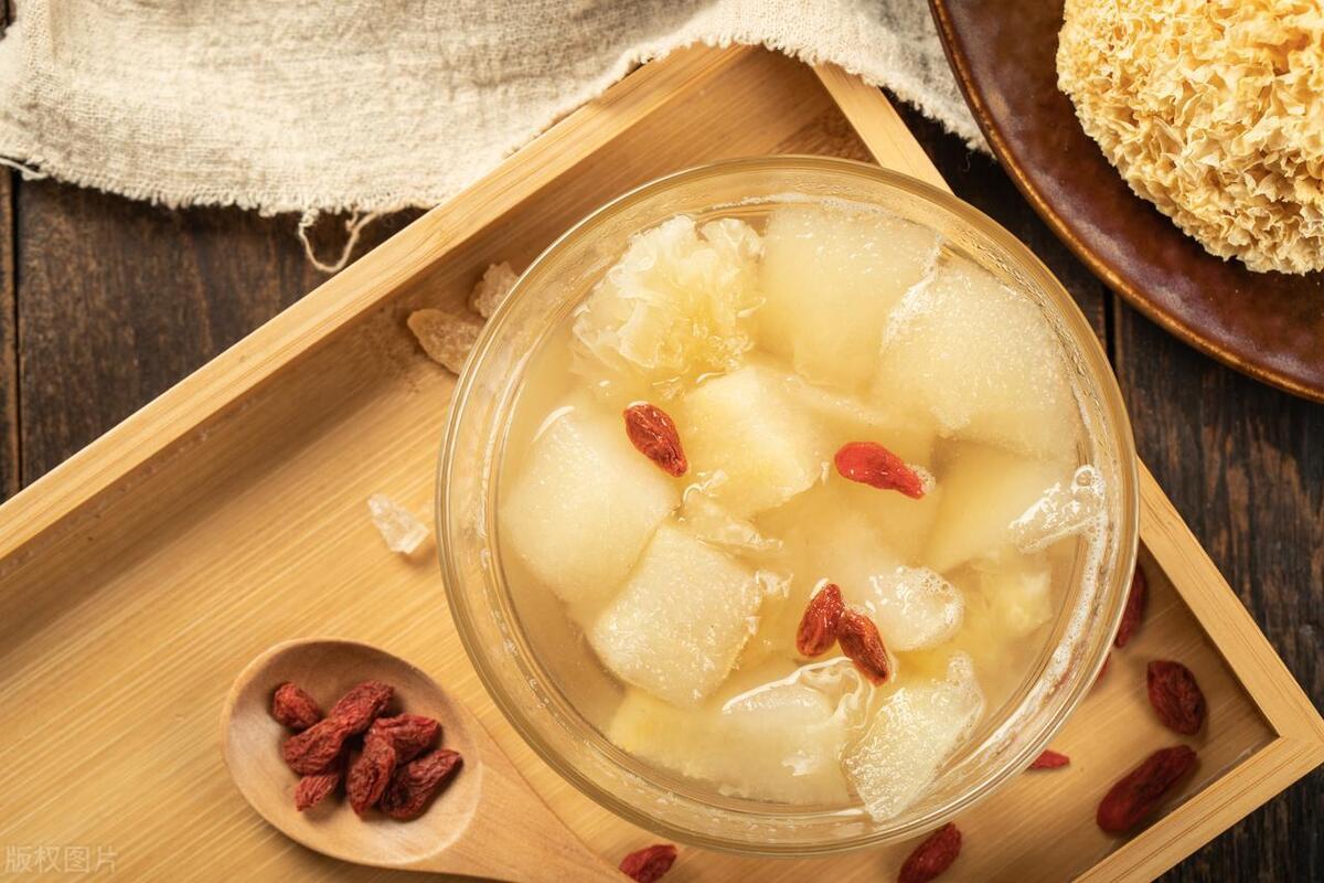 2、放入冰糖,大火煮開後轉小火煮至梨肉軟爛。加入枸杞,再煮幾分鐘即可。