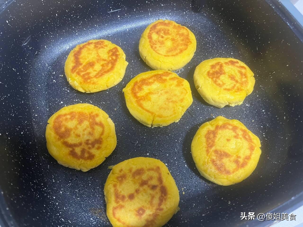 平底鍋刷一層食用油,揪一塊玉米麪團圓後摁壓成小餅胚,然後把玉米餅胚放在平底鍋內,蓋上鍋蓋烙煎2分鐘,隨後掀開鍋蓋再煎另一面,全程煎7-8分鐘就可以。
