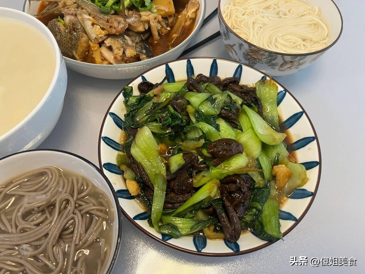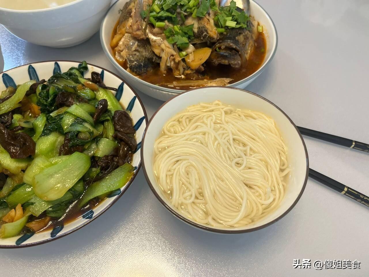 中午也沒有熱饅頭,就丟了一把清水掛麪,正好一人一碗,連水帶掛麪一塊錢喫,再搭配兩個菜,一頓簡單的午餐飯就做好了,葷素搭配很營養,是不是看上去很有食慾,真的是太好喫了。