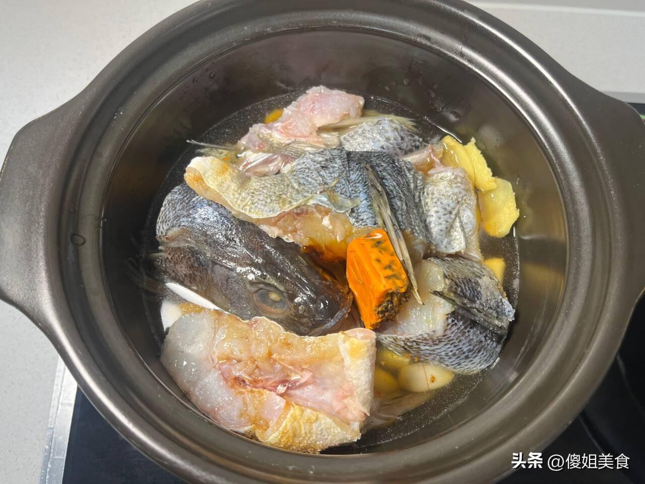 2、把醃好的魚塊放入乾淨的砂鍋內,再往裏面丟半塊火鍋底料,倒入適量的清水,蓋好蓋子開始燉就可以,水開後用小火燉5分鐘就可以,中途不要用鏟子去搗魚塊,避免把魚塊搗碎。最後把燉好的魚肉倒入盤子內,撒上點香菜就可以,香辣鮮美又入味的燉鱸魚就做好了,這一大盤我兩個人都喫完了,太香了。