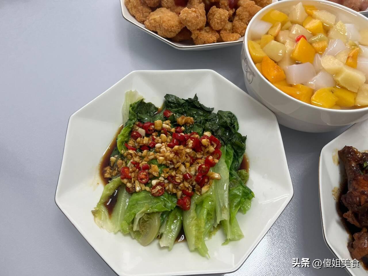 最近這蔬菜價格高的有點意想不到,生菜葉都要6塊錢一斤。這道蒜末生菜葉做法很簡單,生菜葉洗乾淨後用熱水略燙一下就可以,把燙過的生菜葉平鋪在盤子內,整點蒜末、小米辣放在小碗內,倒點味極鮮、陳醋、蠔油和香油拌個料汁,把料汁澆在生菜葉上就可以,酸辣爽口,開胃又好喫。