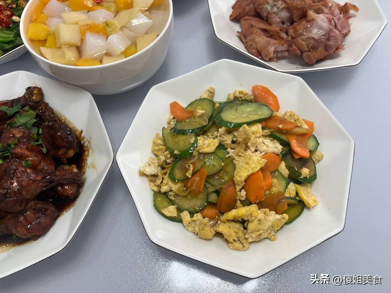 要不說我嫂子做飯好喫呢,就連青菜搭配的都五顏六色,就光看這菜的色澤就特別的有食慾。用黃瓜、胡蘿蔔、雞蛋搭配炒的,鮮美清淡還好好喫,比肉菜都受歡迎,這菜我喜歡喫。