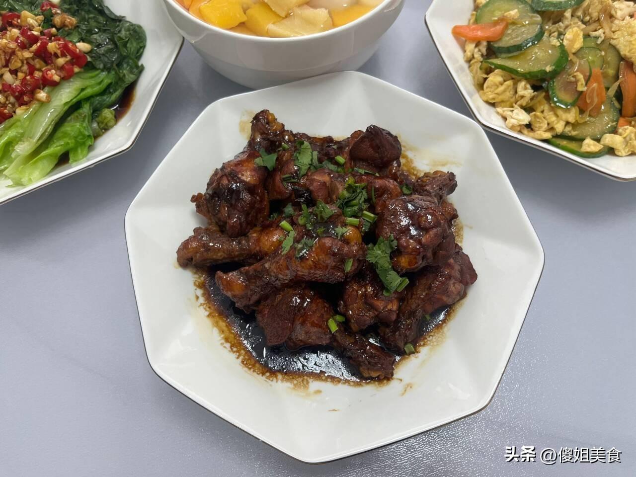 這道菜是孩子們愛喫的,雞翅根比雞肉好喫,骨頭少肉多。首先把雞翅根洗乾淨後焯水,然後再起鍋燒油炒糖色,放蔥姜、八角、醬油、味極鮮、料酒和鹽調味上色,倒入適量的可樂和清水,燉一會把鍋裏面的水煮差不多就可以,色香味俱全,好喫到添手指頭。
