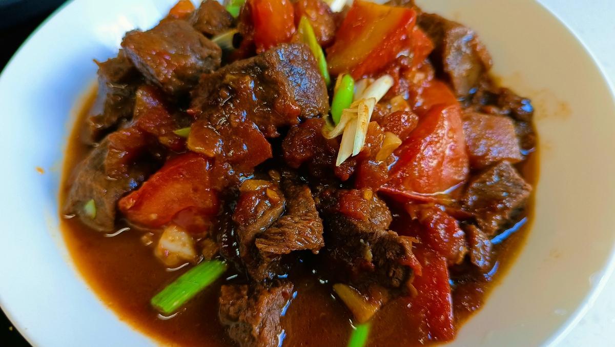 4.牛肉經過長時間的小火慢燉後,會逐漸變得酥軟入味,大約燉煮一個小時後,再將另一個切好的西紅柿塊倒入,調至大火翻炒收汁,收至湯汁濃郁後,再根據自己的口味撒上一點蔥花或香菜段提鮮,香軟入味的番茄燉牛肉就做好了,好喫又下飯,超美味!