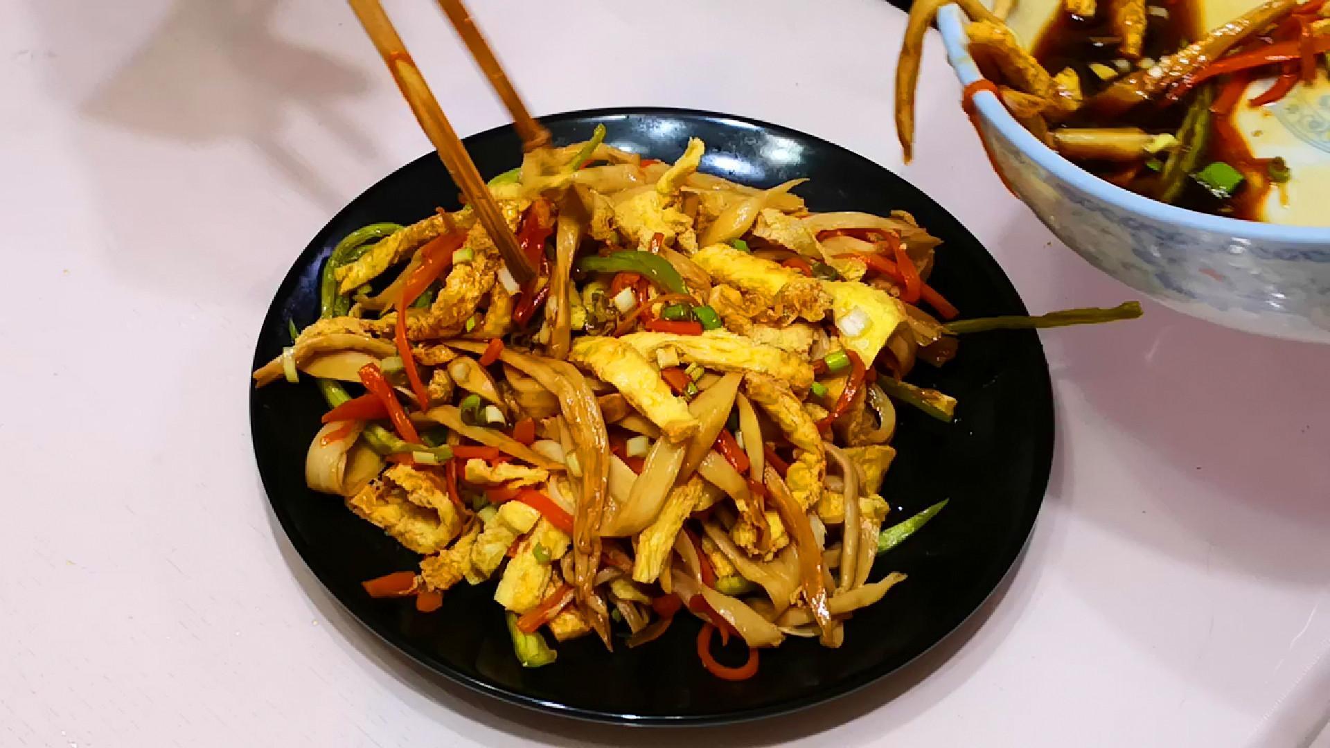 1.杏鮑菇適量洗淨後撕成長條備用;再準備適量的胡蘿蔔絲、青椒絲做配色用;