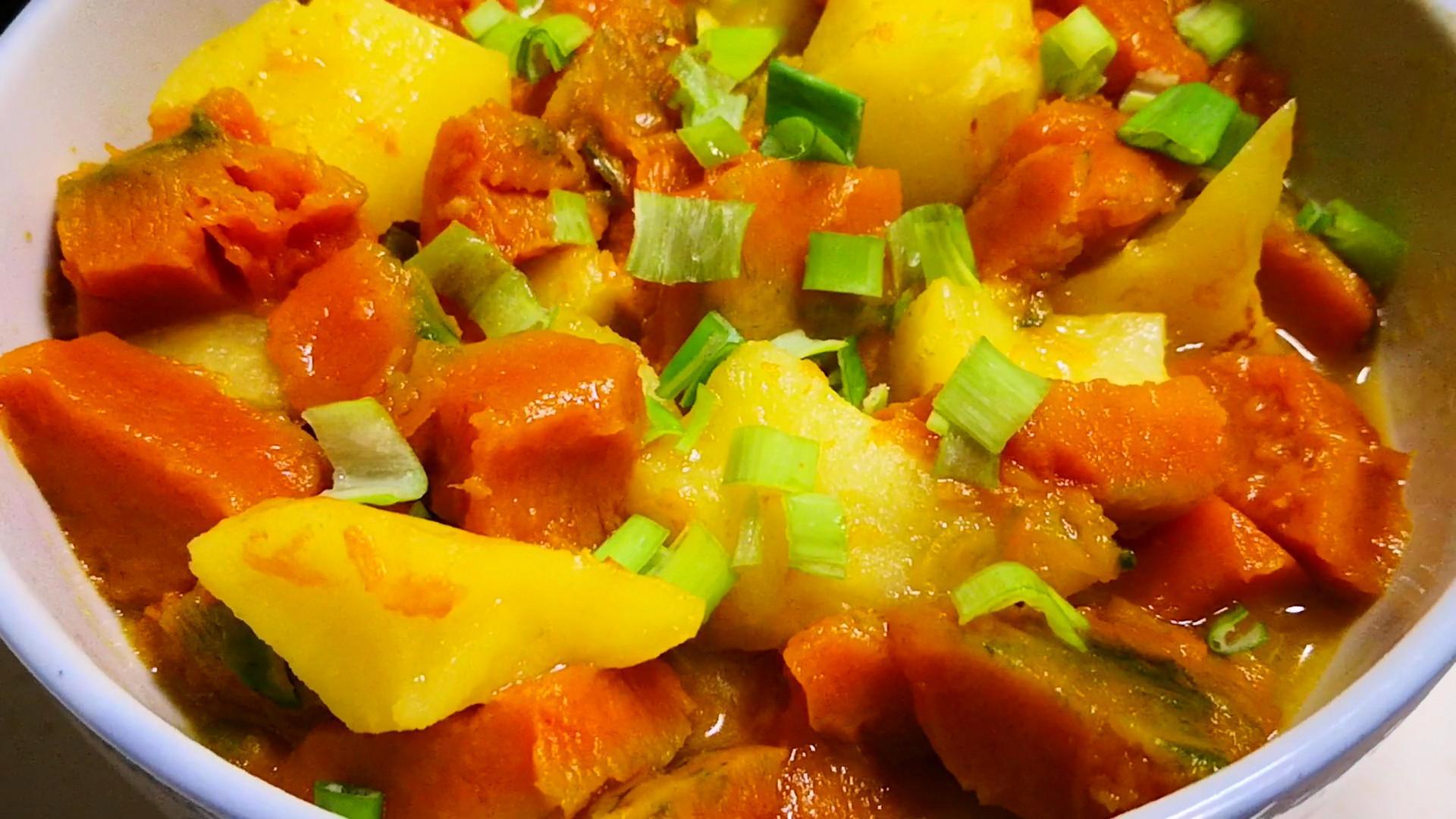 3.燉至南瓜和土豆變得軟爛入味後開鍋,再改成大火收汁,湯汁變濃郁後再撒上一把蔥花,即可出鍋,香糯可口,特好喫!