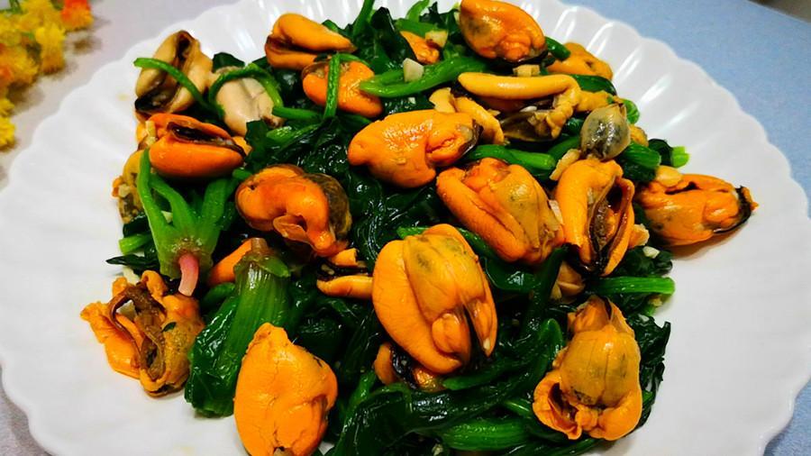 3.然後將切好的菠菜和煮熟的海虹肉放到一起,再加入適量的食鹽、白糖、味極鮮、香醋和少許香油調味,攪拌均勻後裝盤即可,太鮮美了!