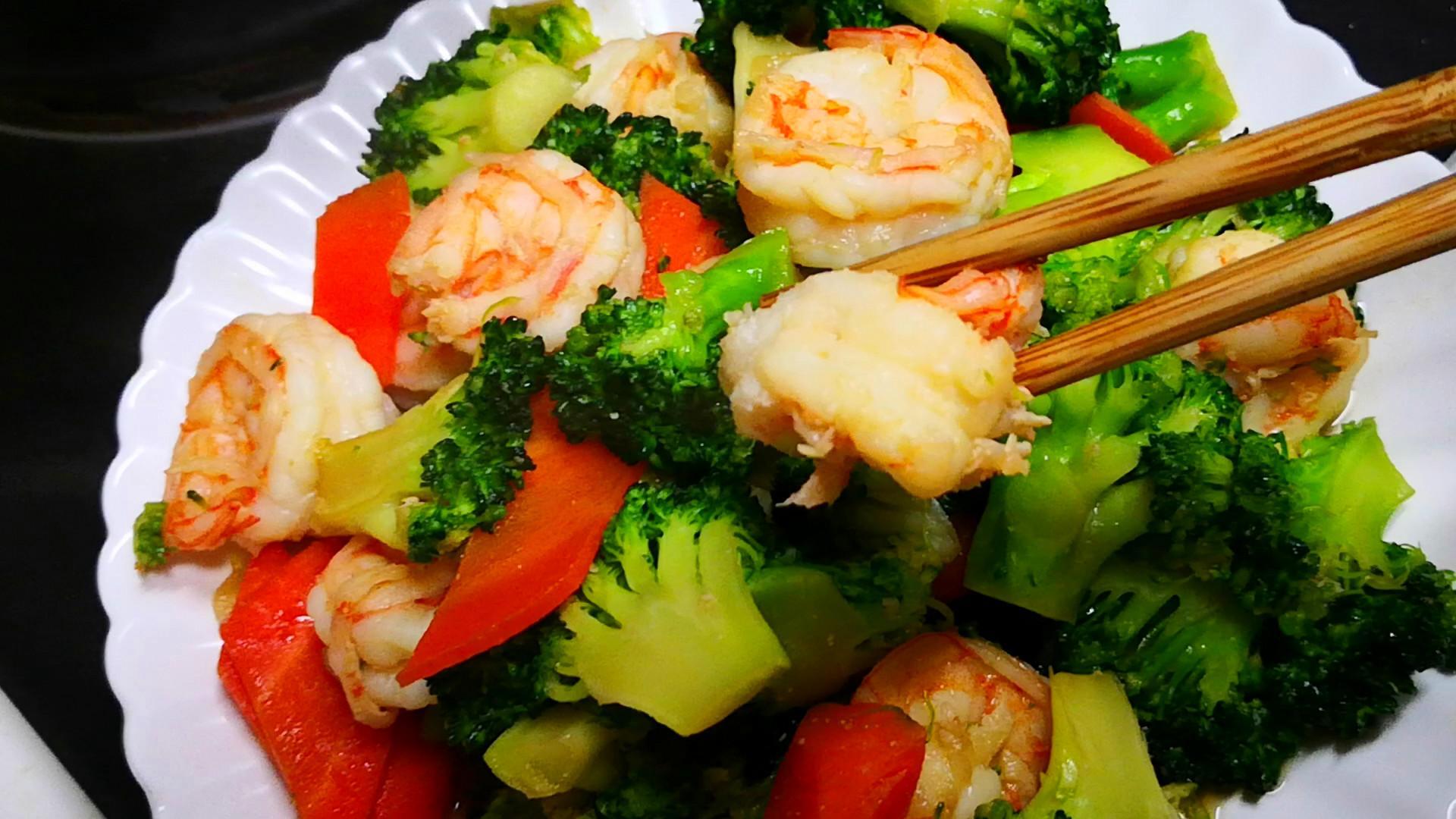 3.鍋內加油燒熱,先放入蒜片炒香,再下入蝦仁翻炒,中火翻炒片刻,炒至蝦仁顏色變紅後再倒入西蘭花和胡蘿蔔片,繼續翻炒片刻後加入鹽、生抽、蠔油和少許白糖調味,再次大火炒勻後即可關火出鍋。