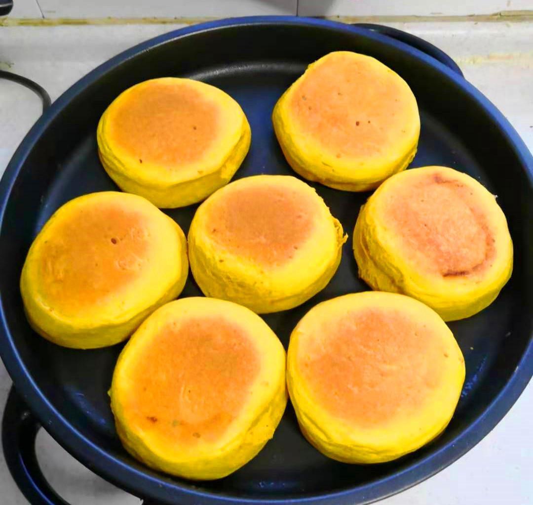 3.取一個電餅鐺不需要抹油,將醒發好的南瓜餅擺入,蓋上蓋子烙1分鐘左右開鍋,翻面成再繼續烙,烙至餅的兩面都呈金黃色,輕輕按壓一下能夠自然回彈就熟了,起鍋裝盤即可!