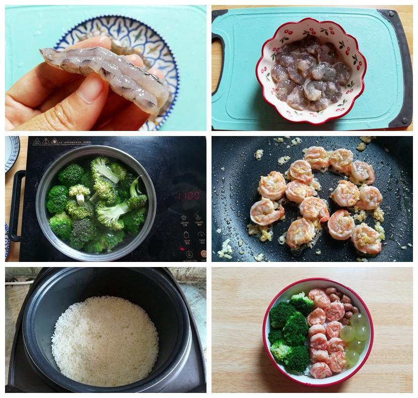 【西蘭花蝦仁飯】食材:米飯、西蘭花、大蝦、水煮花生米、葡萄、大蒜、生薑、玉米澱粉、食用油
