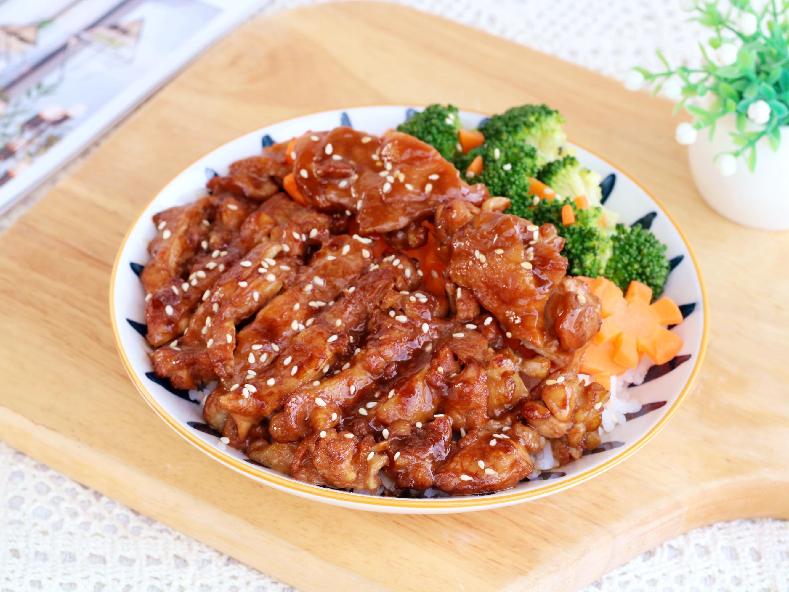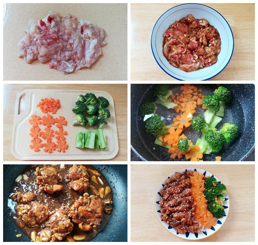 【醬燒雞腿飯】食材:米飯、雞翅根、胡蘿蔔、西蘭花、生薑、大蒜、白芝麻、料酒、食用油、生抽、蠔油