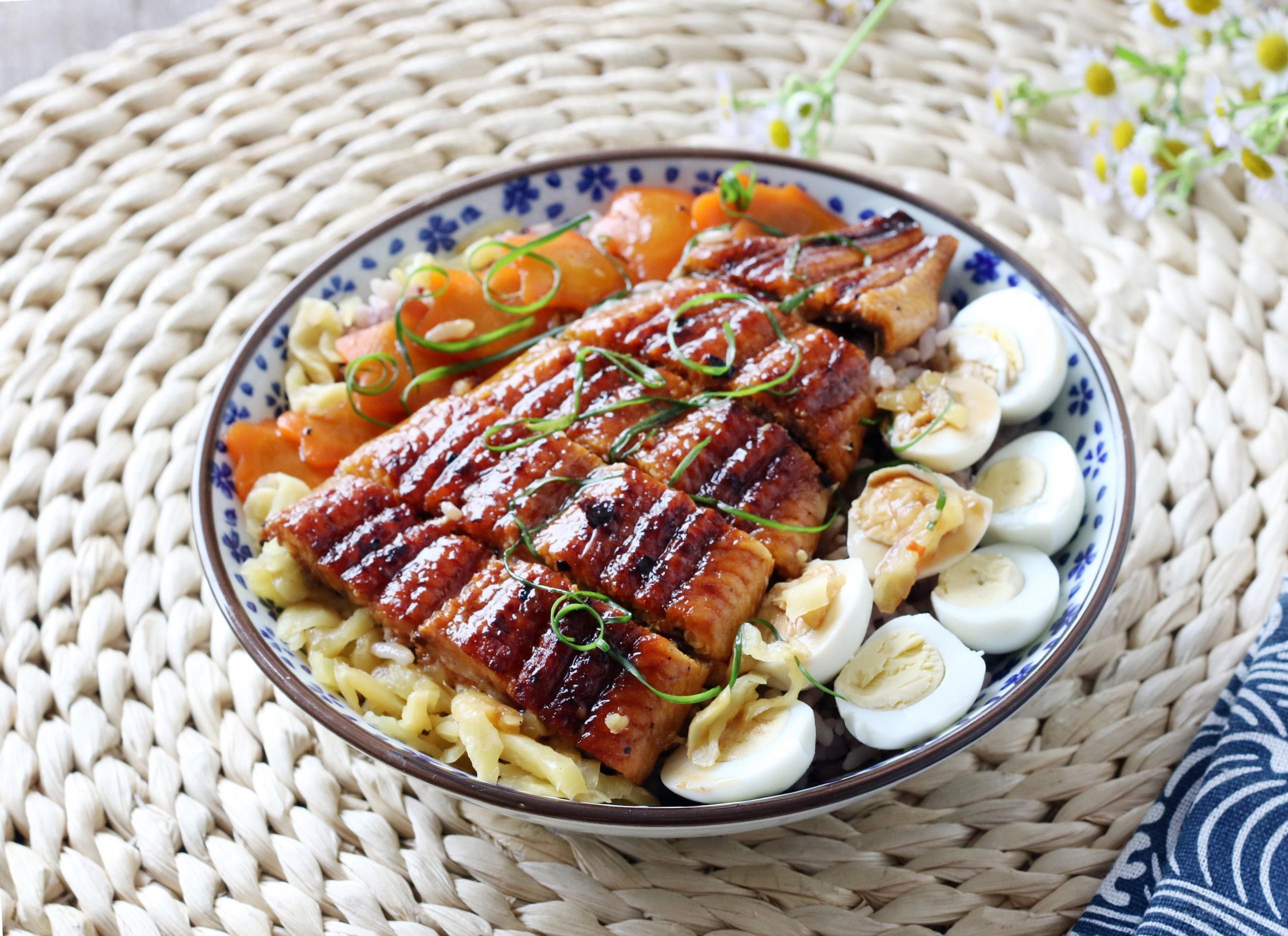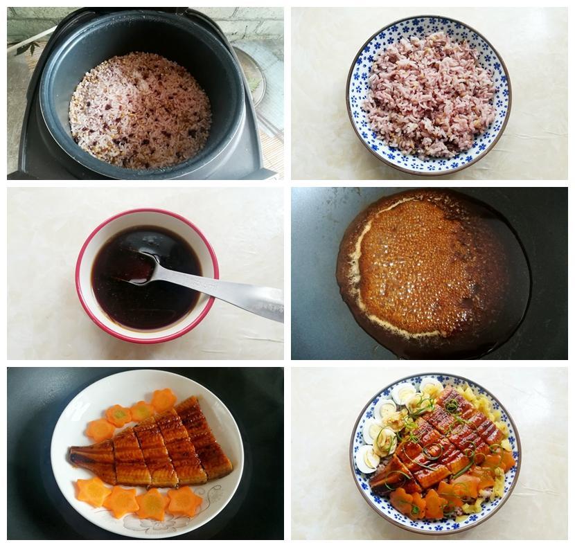 【鰻魚粗糧飯】食材:粗糧米飯、即食鰻魚、胡蘿蔔、榨菜、鵪鶉蛋、生抽、蠔油、芝麻油、香蔥