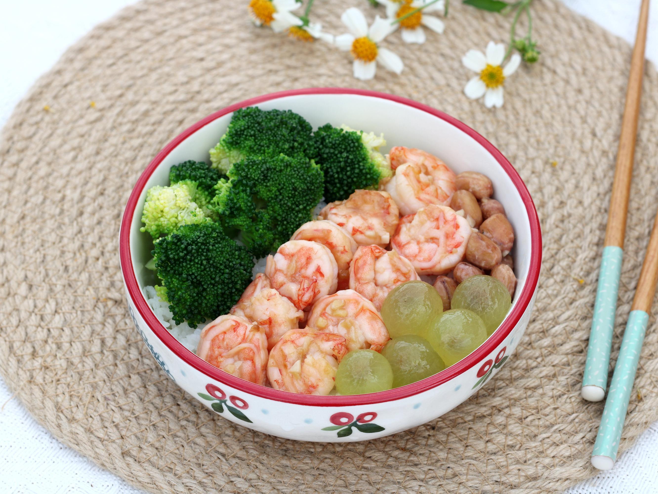4,米飯煮熟後舀到碗裏,放上蝦仁、西蘭花、花生米和剝皮的葡萄。