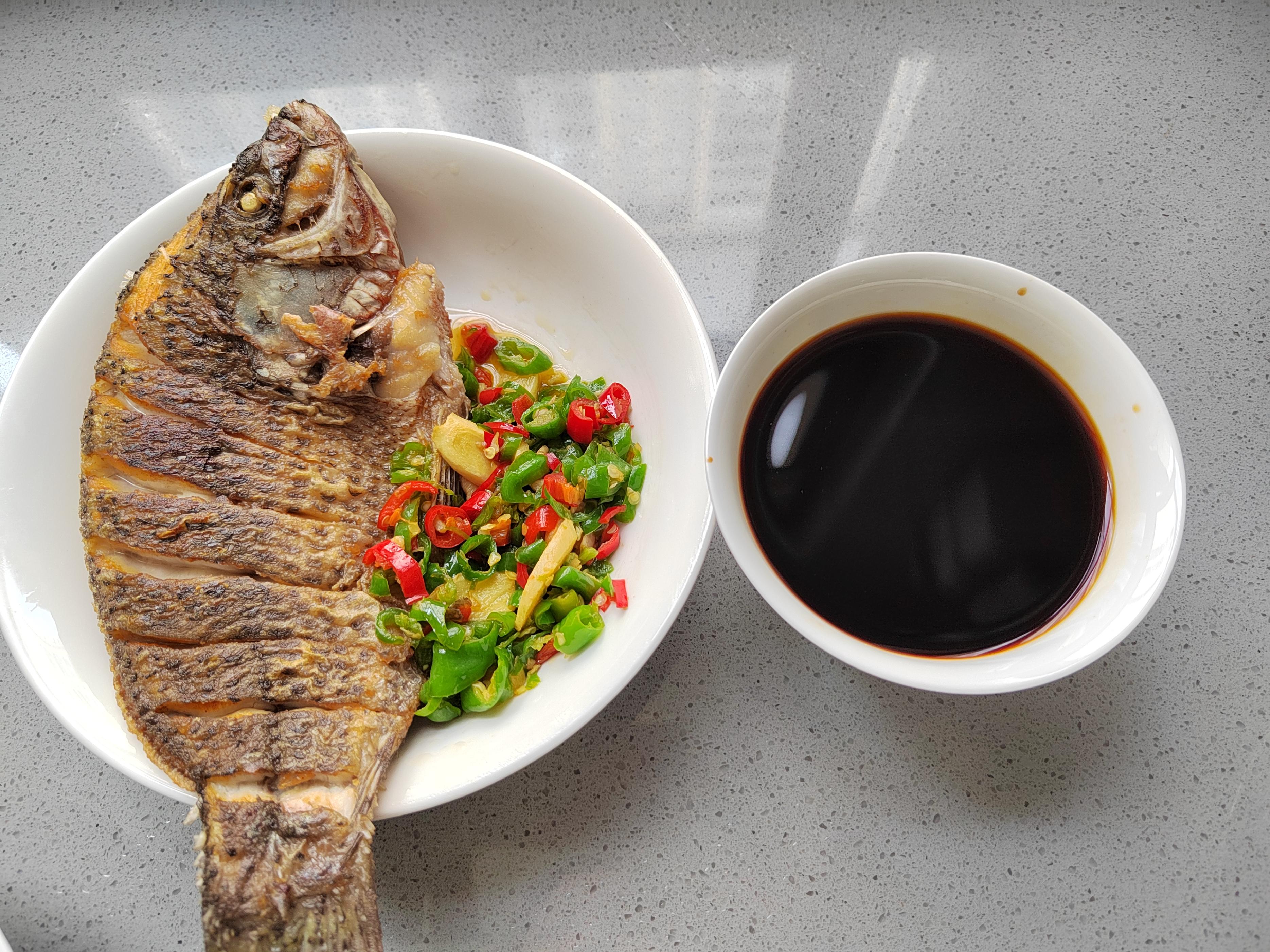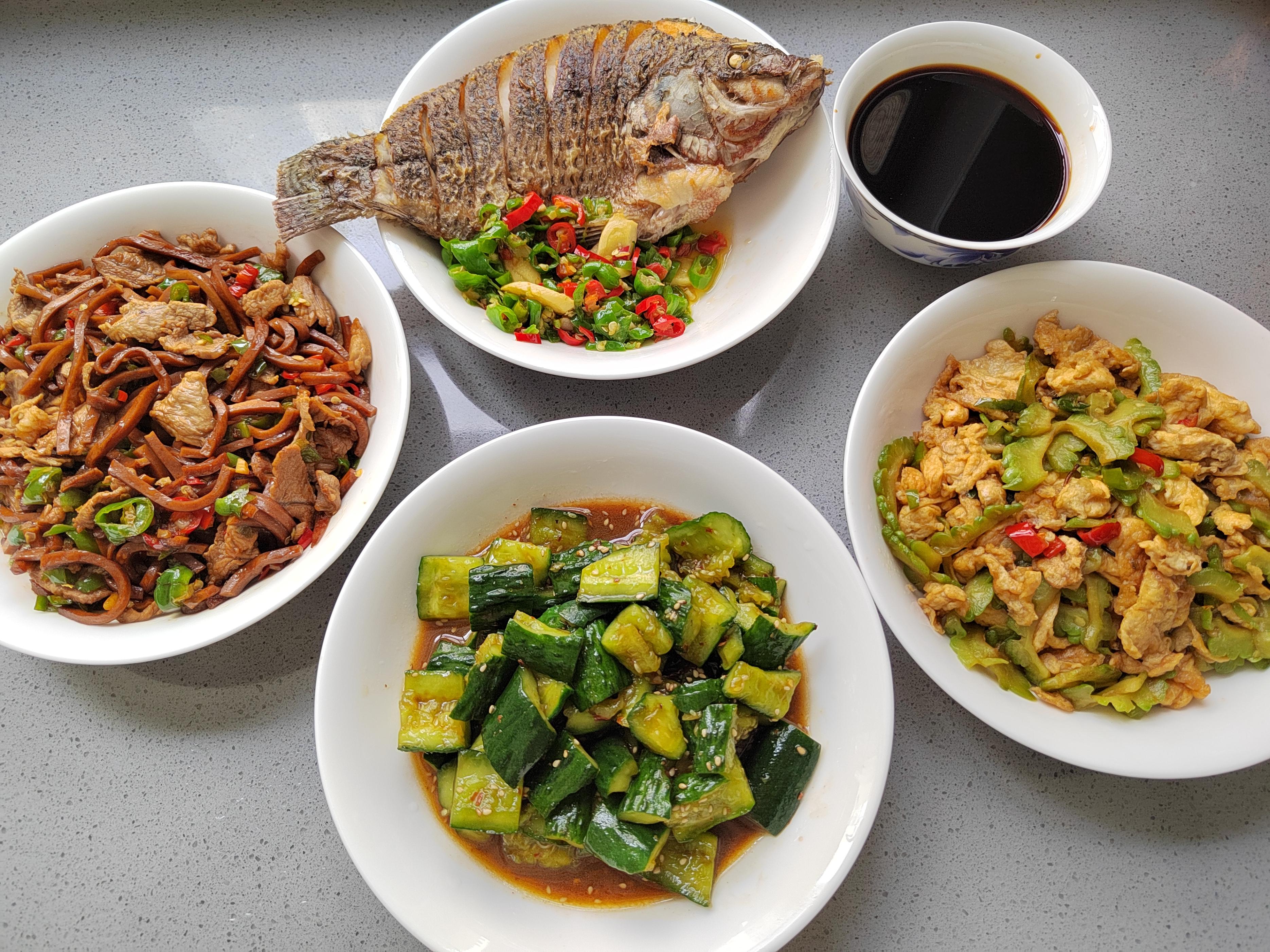 這個煎好的羅非魚原本是準備紅燒的,搭配的辣椒和調味的醬汁也準備好了。看了下前面3個菜的分量都挺多的,足夠我們4個人喫了。加上紅燒羅非魚估計是喫不完,就讓母親先不做了,留着晚上再煮吧。