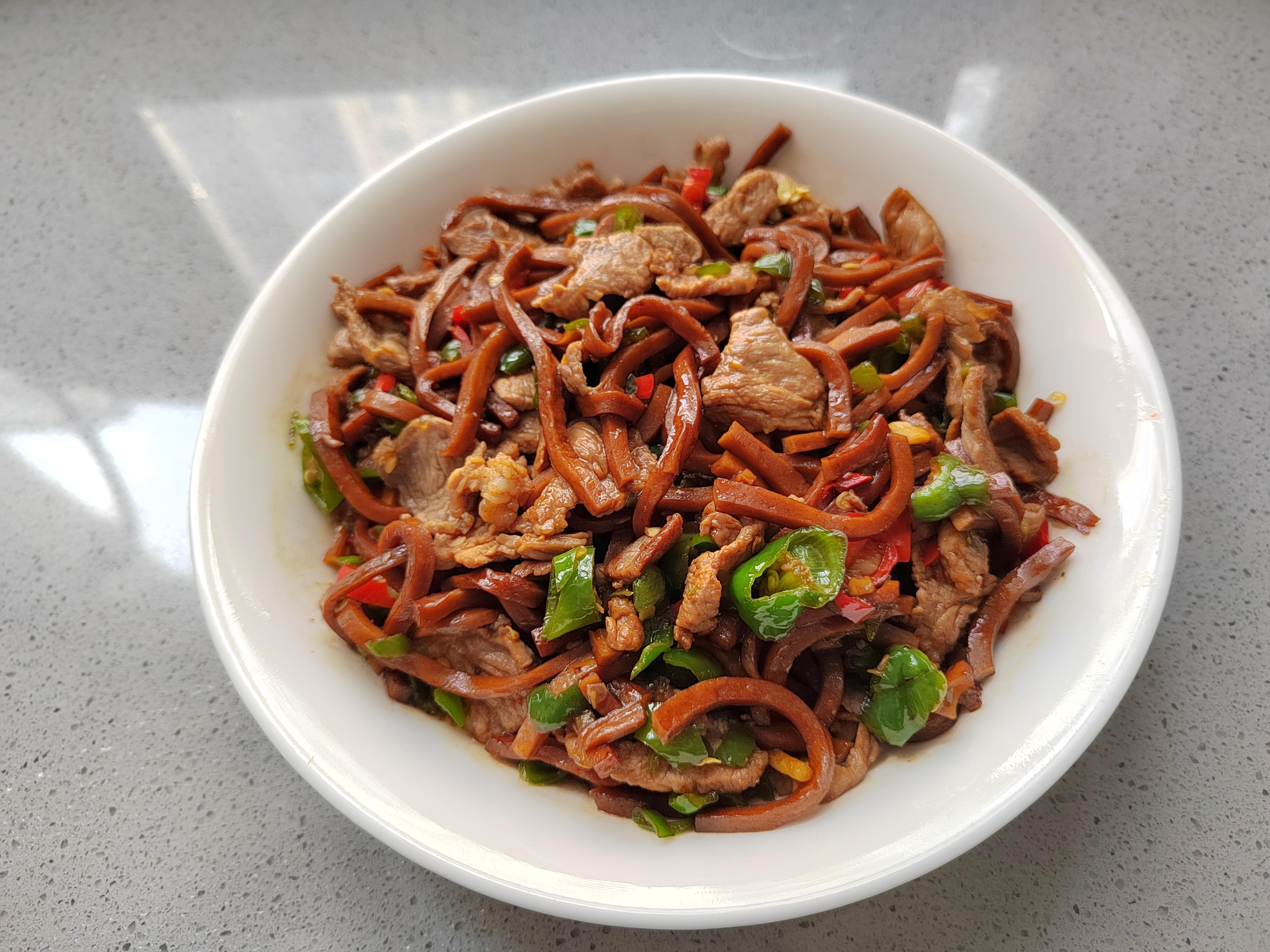 【辣椒瘦肉炒千葉豆腐絲】母親家附近有一家滷豆腐絲特別好喫。滷過的豆腐絲很入味,買上小半斤豆腐絲,隨便搭配一點辣椒和瘦肉,就是一份特別美味的下飯菜。桂林這邊飲食習慣跟湖南比較接近,炒菜都喜歡加一點辣椒,不過這次加的青椒不是很辣,孩子也能喫。