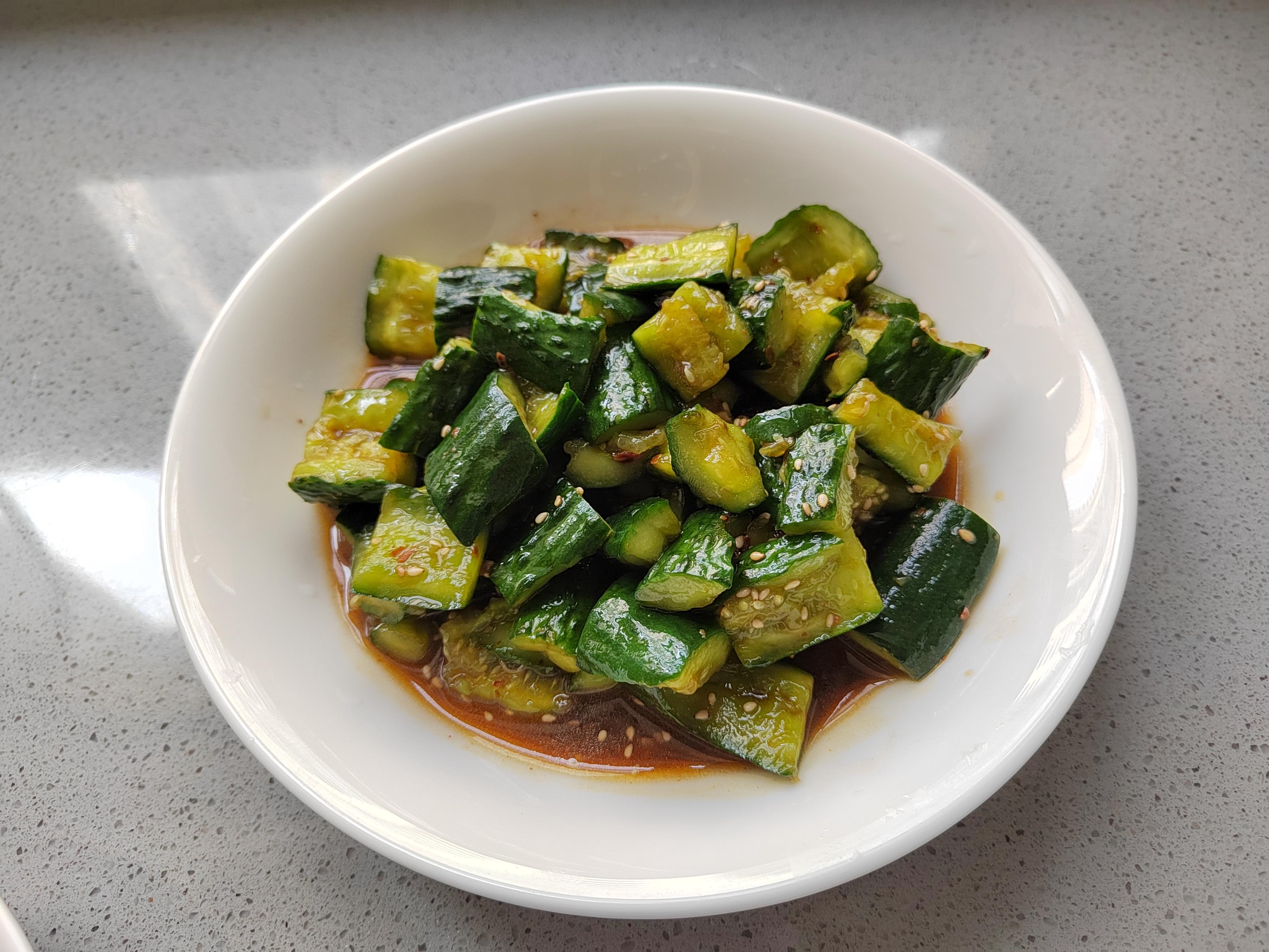【涼拌拍黃瓜】最近天氣還是挺熱的,來一份拍黃瓜,做好以後放冰箱冷藏半個小時,喫起來有點涼涼的,特別爽口。母親這次做的拍黃瓜沒放辣椒,只加了一點辣椒油調色,撒上白芝麻,孩子很喜歡,連喫了好幾塊。