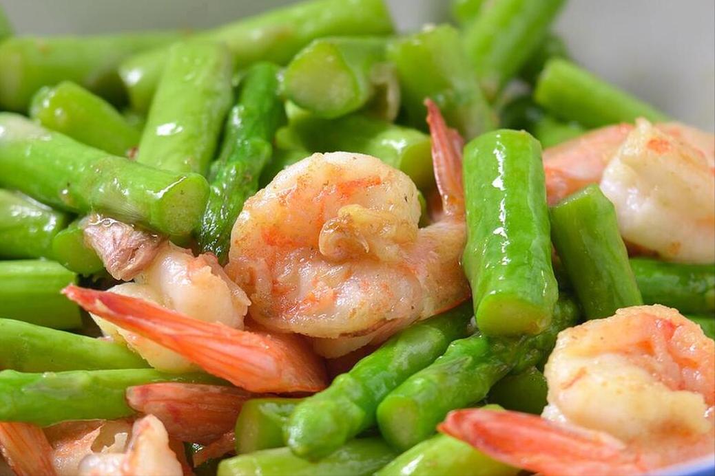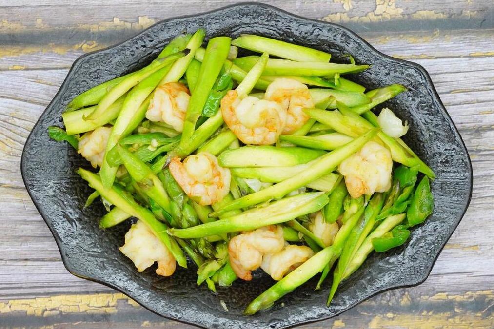 食材:蘆筍、蝦仁、蔥花、鹽、黑胡椒粉、雞精、料酒、蠔油、食用油