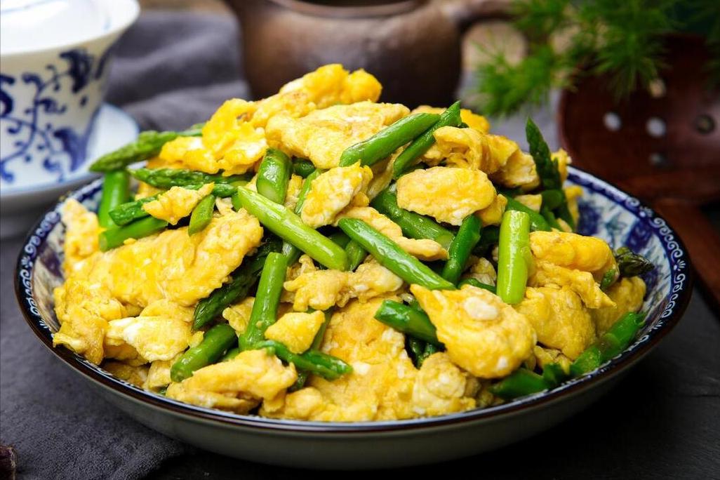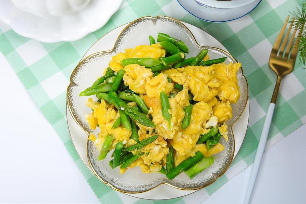 2、隨後鍋中倒油,燒熱下入蛋液開始翻炒,炒熟、定型後盛出來備用。隨後重新往鍋子裏來點油,燒熱以後下入蘆筍翻炒,炒到斷生之後我們再把雞蛋倒在裏面,簡單翻炒兩下之後,倒入鹽、雞精進行調味,翻炒均勻後出鍋開喫!