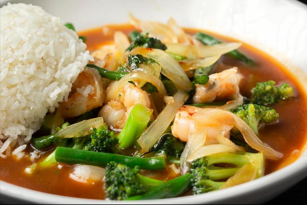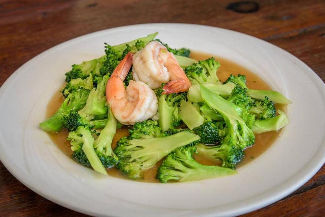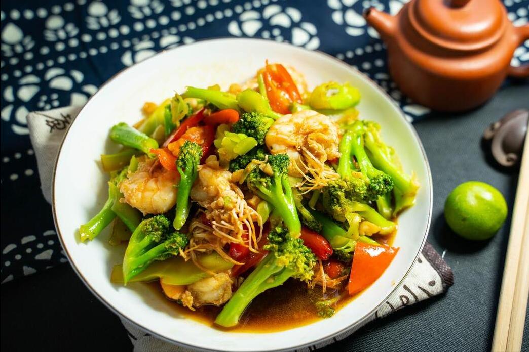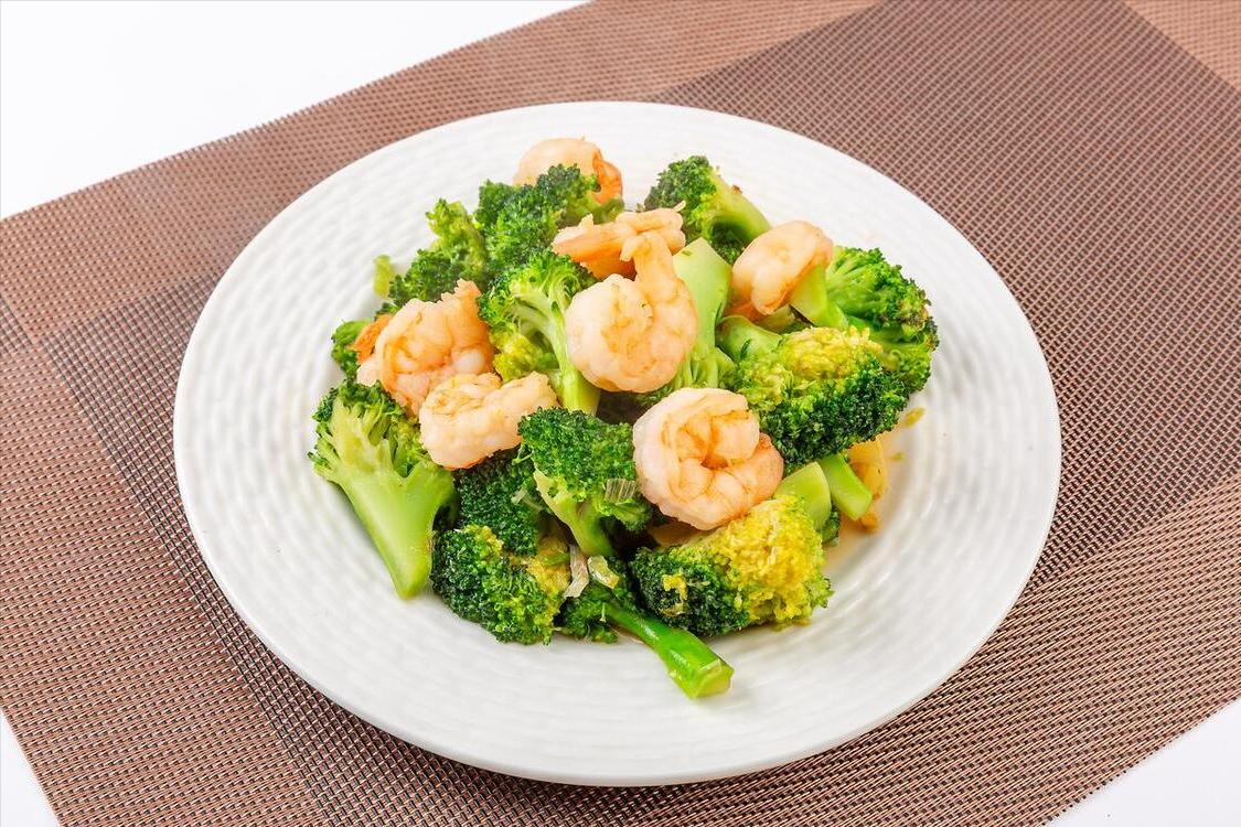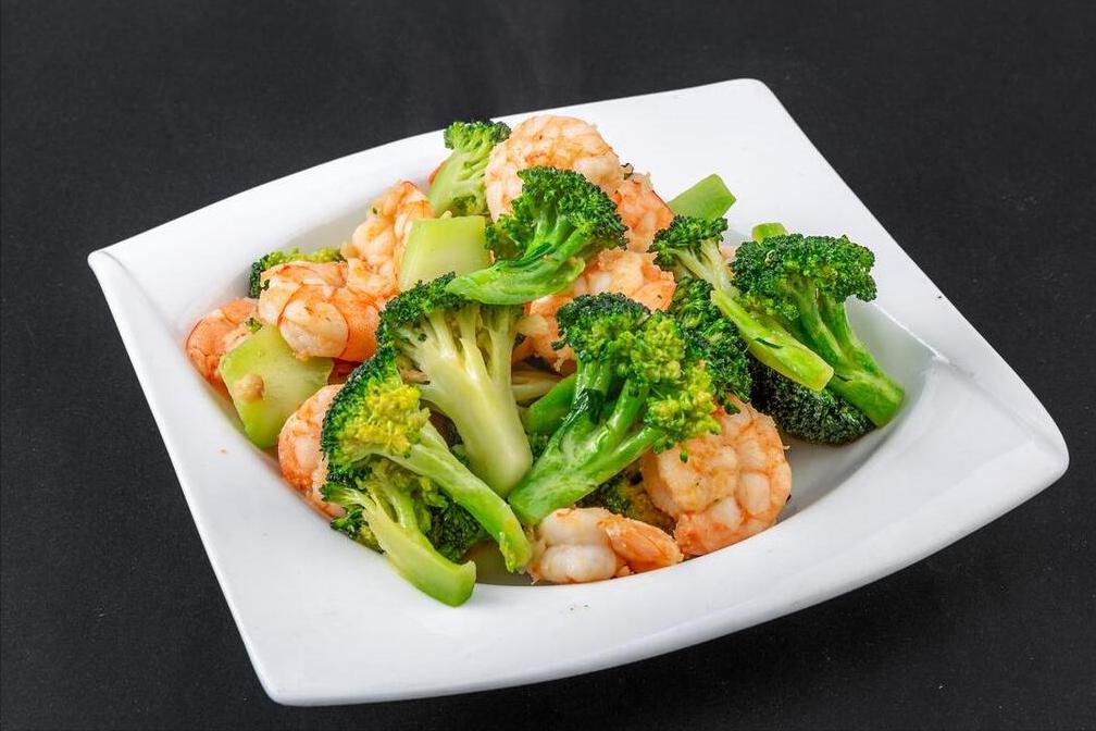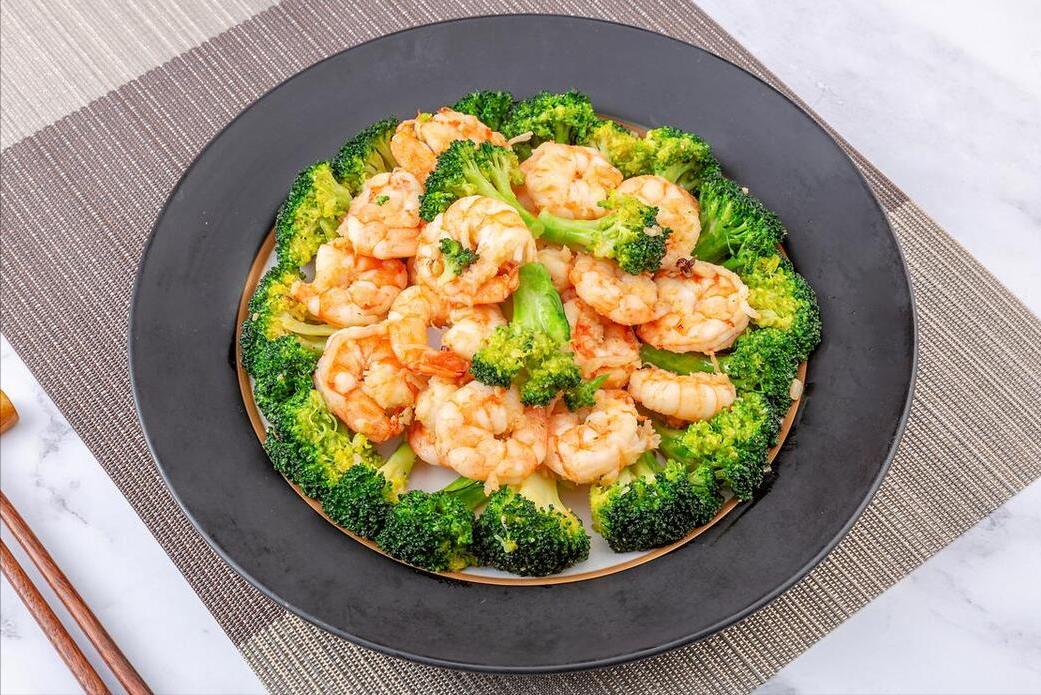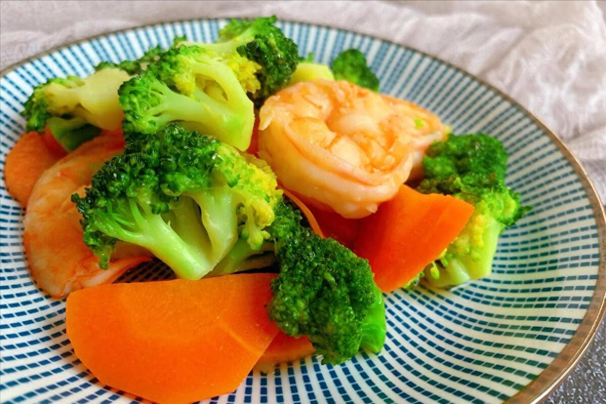 食材:西蘭花、蝦仁、胡蘿蔔、大蒜、蔥花、食鹽、白胡椒粉、雞精、醬油、蠔油、料酒、食用油