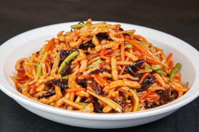 3、最後加入生抽、醋、白糖、鹽、雞精等調料,翻炒均勻即可。魚香肉絲色香味俱佳,讓人食慾大增。