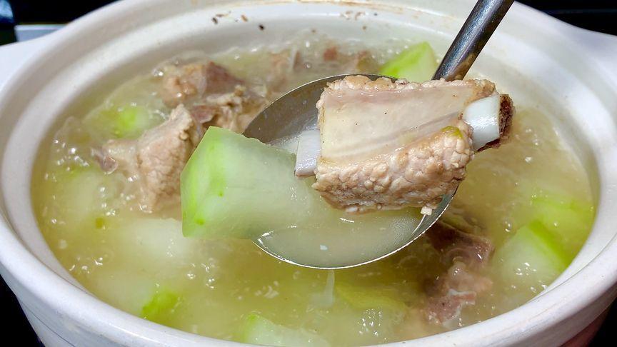 2、將排骨放入燉鍋中,加入足量的熱水,放入薑片和蔥段,大火燒開後轉小火慢燉 1 - 1.5 小時。加入冬瓜塊,繼續燉煮 30 - 40 分鐘,直到冬瓜變得透明熟透。根據個人口味加入適量的鹽和白胡椒粉調味即可。