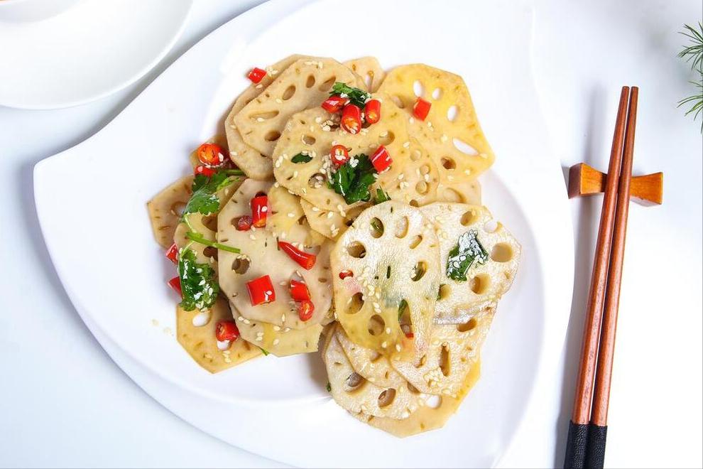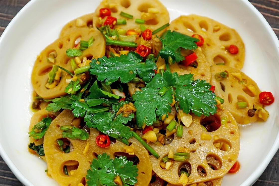 用到:蓮藕、小米椒、辣椒麪、白芝麻、蒜末、香菜、鹽、味精、醋、生抽、食用油