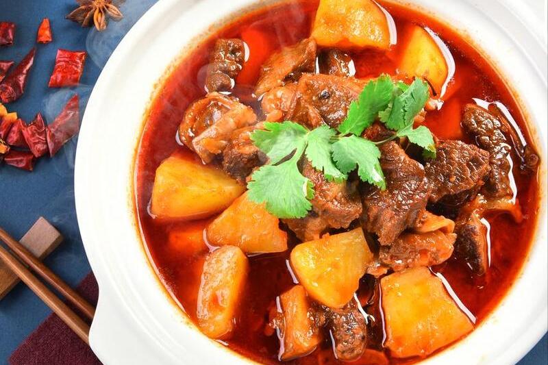 2、鍋內倒油燒熱,下入牛肉翻炒到上色後,倒入八角等香料,然後加入生抽、蠔油調味,接着添上足量的開水,順便來幾塊冰糖,下面開始燉。大火燒開後,小火燉上40分鐘,再把土豆、番茄倒進去,繼續燉20分鐘,最後加入鹽、味精調味,收汁後開喫。