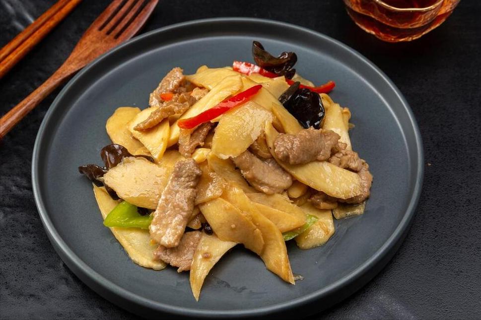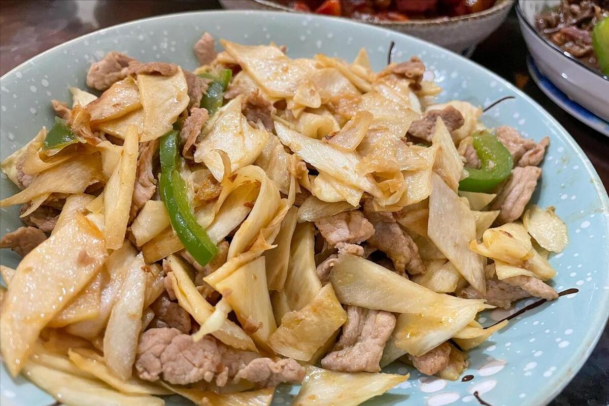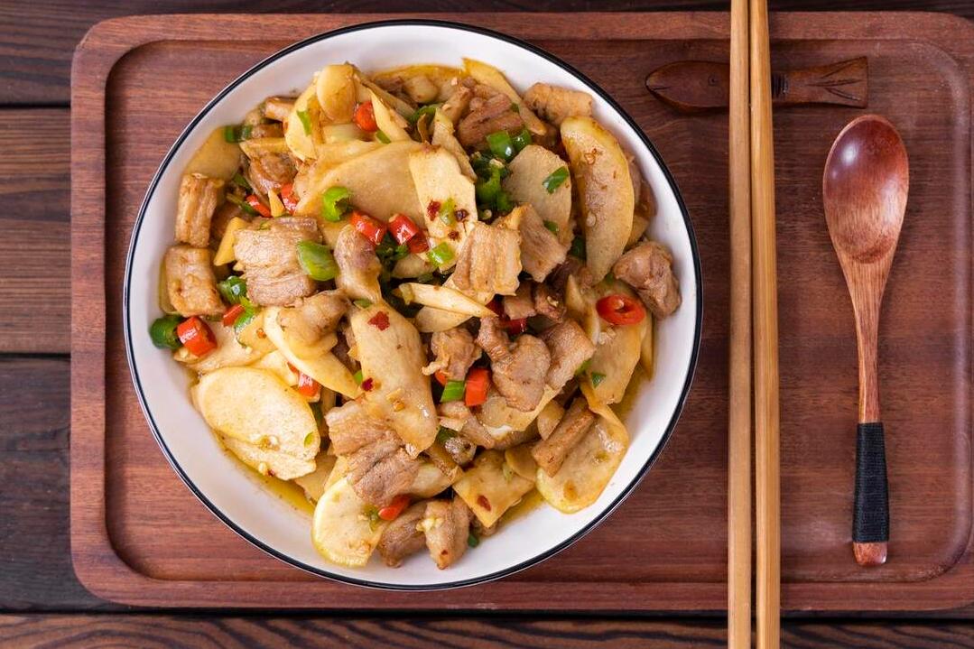 用到:茭白、五花肉、花椒、幹辣椒、薑片、鹽、味精、料酒、食用油