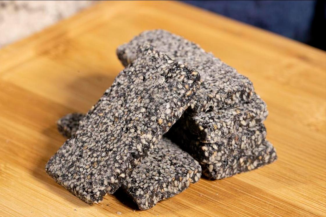 2、開中小火開始不停翻炒,直至由大泡轉變爲小泡,溫度變爲145度左右,馬上關火。將其迅速倒入黑芝麻中,充分混合均勻,然後倒在一個四方形的模具中,使勁壓實,最後取出來切片就可以啦。