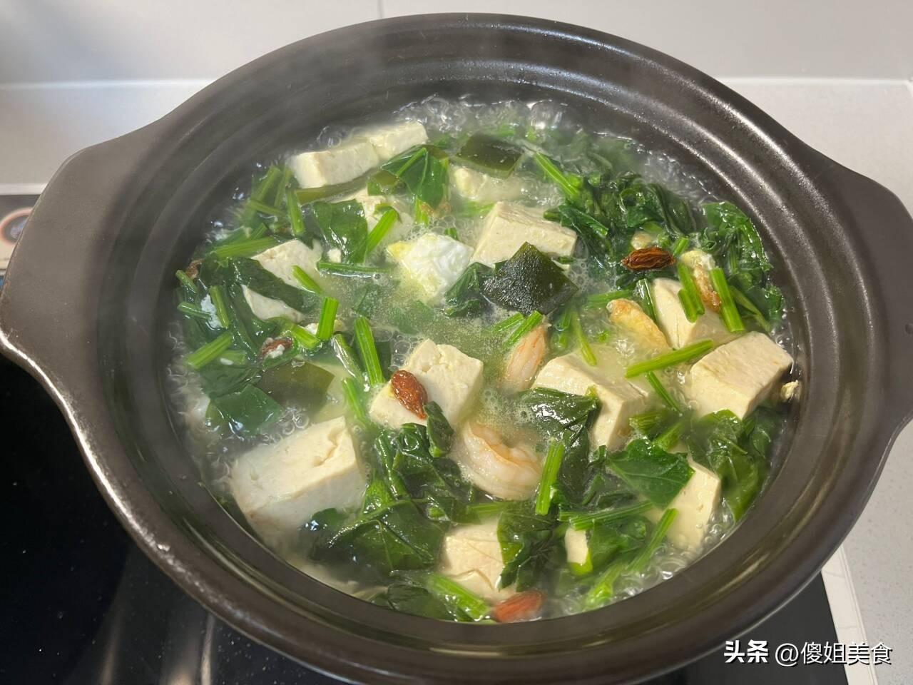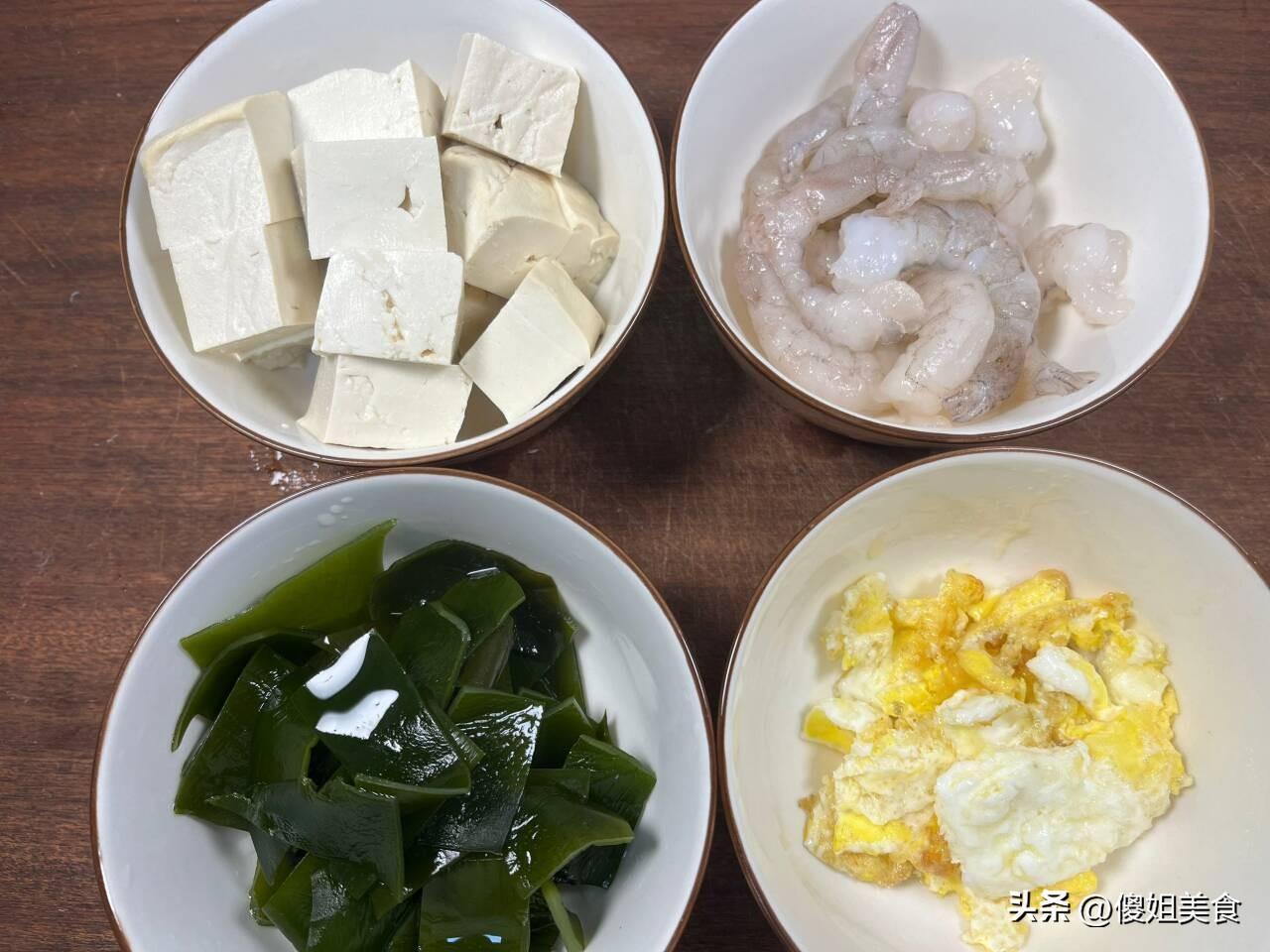 具體做法:1、 首先把所有的備用食材準備好,準備的有蝦仁,蝦仁的營養價值很高,富含很高的鈣,老人孩子都應該多喫一些。還有海帶、滷水豆腐,提前把海帶浸泡洗乾淨,切成大小差不多的塊就可以了。雞蛋要用平底鍋煎熟,然後再切成小塊,煎蛋煮出來的湯汁很濃郁又奶白。最後準備一小把菠菜,菠菜也漲價了,要5塊錢一斤,2塊錢的菠菜擇一下,沖洗乾淨後切成小段,菠菜段裝入盤子內備用就可以。