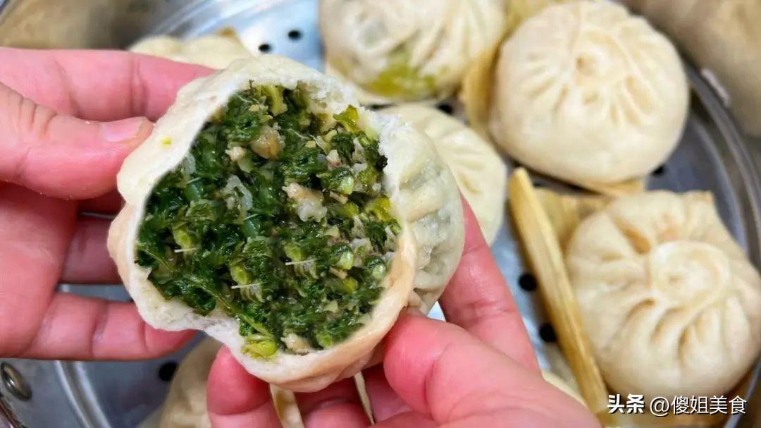 蒸好的苦菜豬肉包子外皮柔軟,內餡鮮香多汁,苦菜的微苦與五花肉的油香完美融合,絕對讓你一口接一口,停不下來!