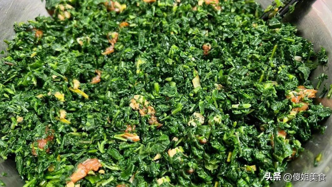 3、將切好的苦菜與調好的五花肉餡混合,充分攪拌均勻,確保每一口包子都有苦菜和豬肉的香味。