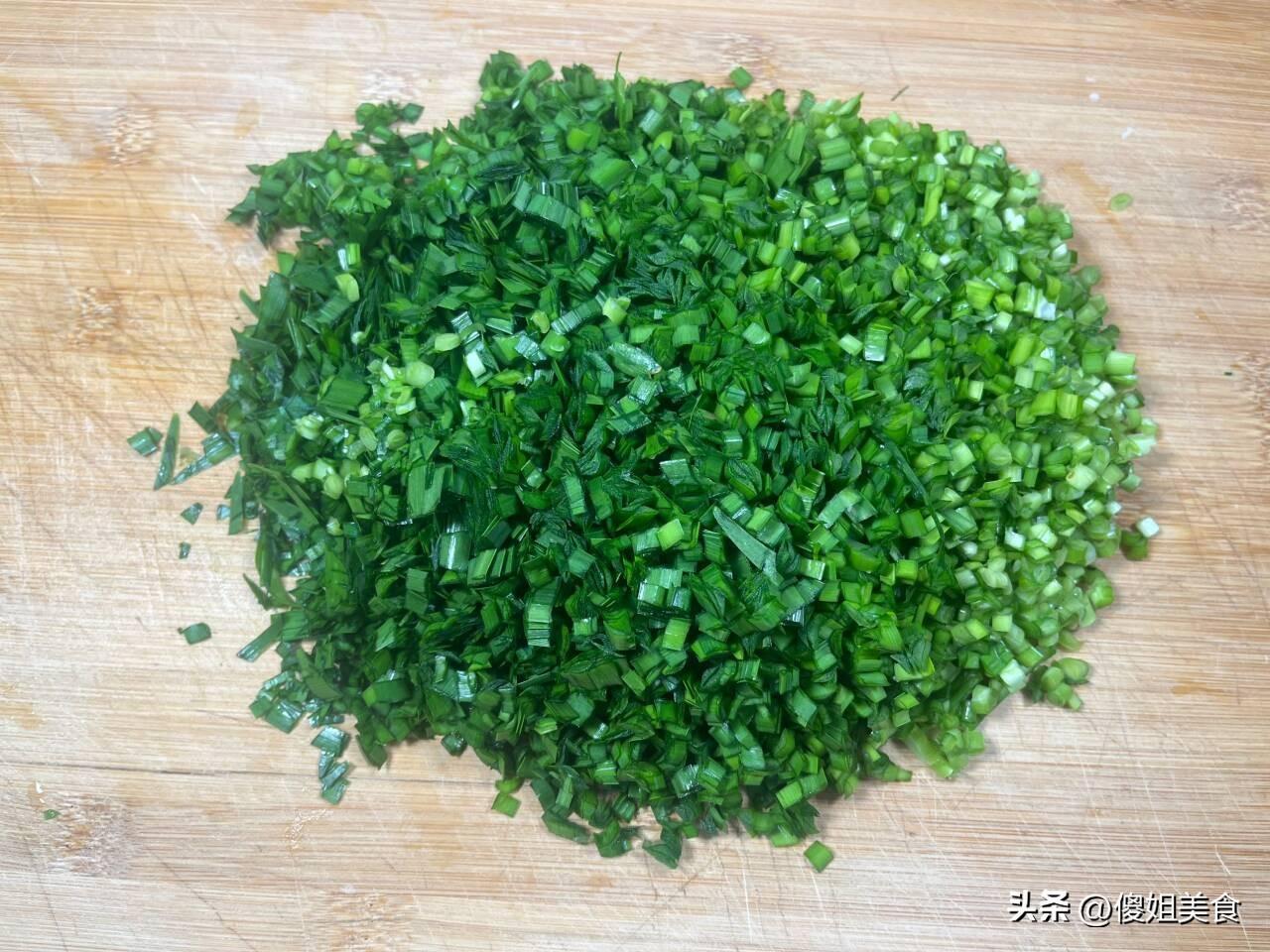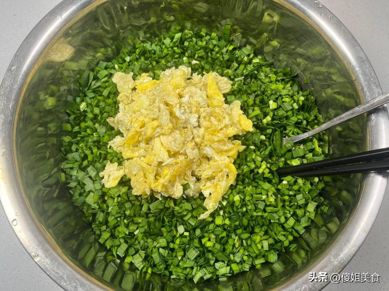 具體做法:1、擇洗乾淨的韭菜用刀切去韭菜根部1釐米左右,根部帶有泥土清洗不乾淨,然後改刀將韭菜切成小碎段, 韭菜容易出水,放2勺食用油攪拌一下鎖住韭菜內的水分。隨後接着炒兩個雞蛋碎,雞蛋碎晾涼後放入韭菜內(不要炒熟就放進韭菜,不然把韭菜燙熟)。