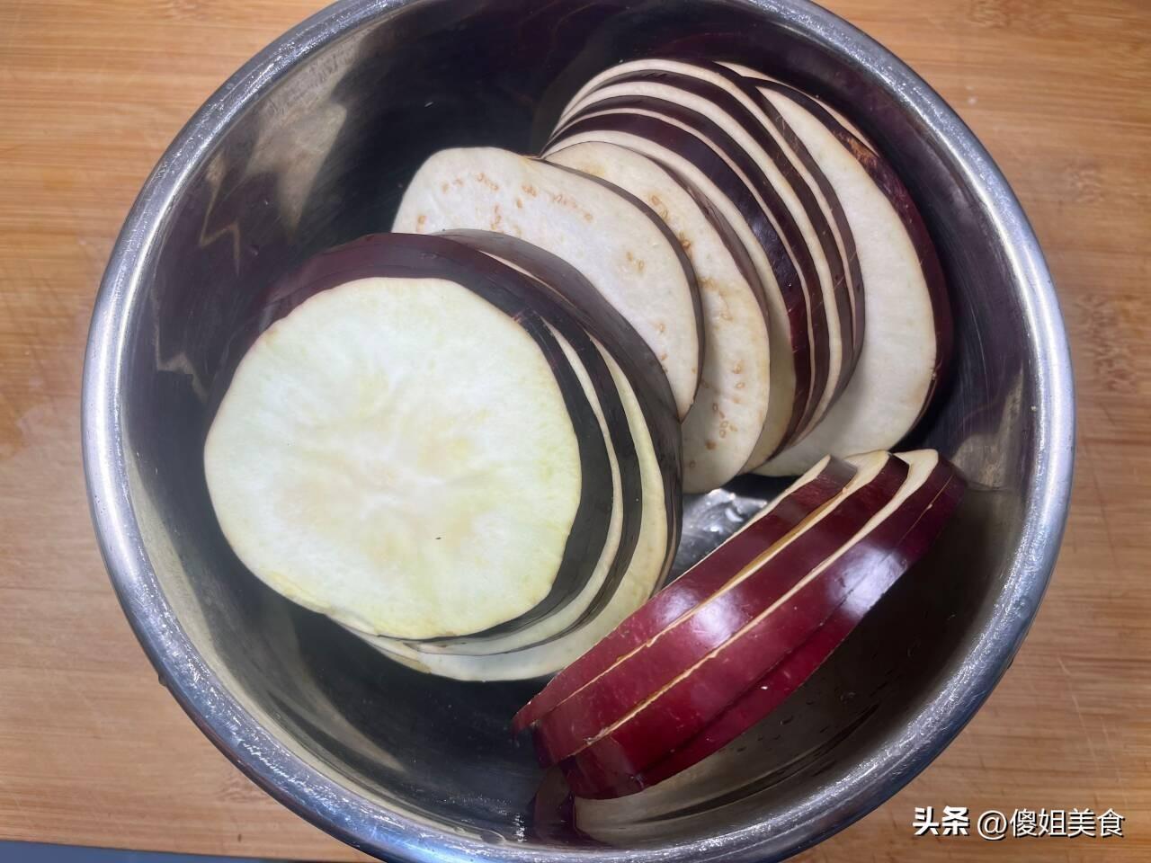2、花2塊錢買了一大鍋超大個的茄子,別看茄子個頭大,還挺嫩。茄子用鹽水清洗一下,把表面的農藥殘留和髒東西清洗乾淨,然後切掉根蒂,改刀切成薄片就可以。