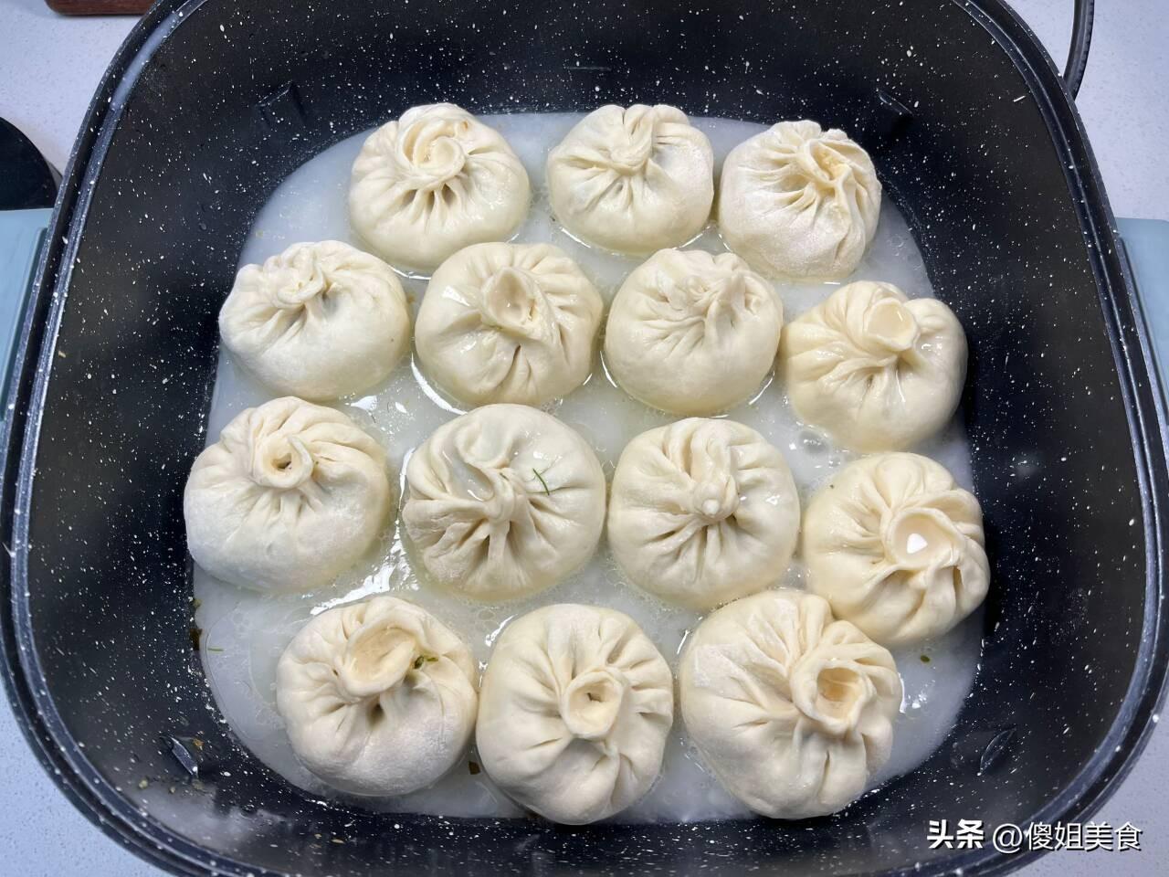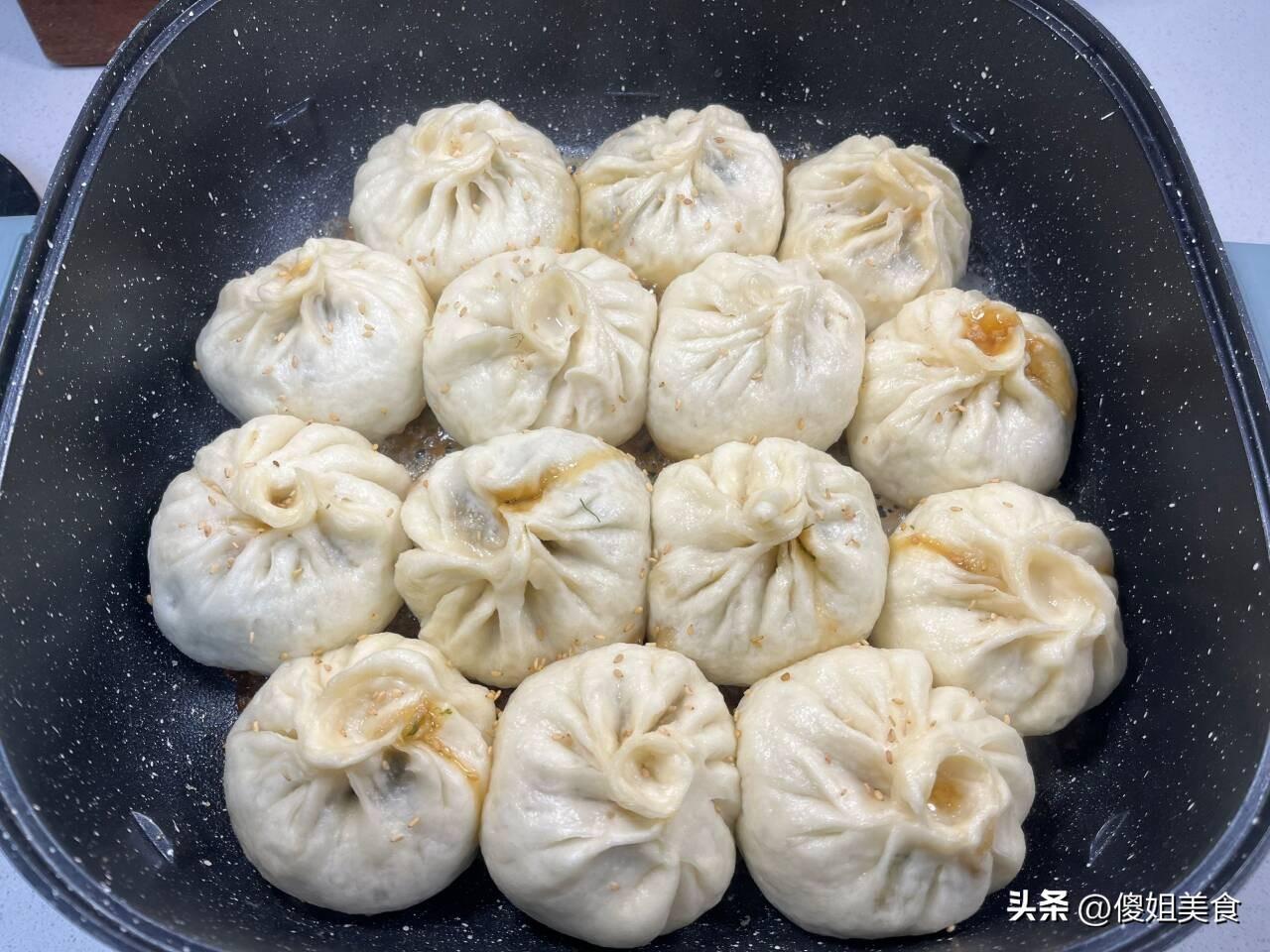 4、平底鍋底部刷上一層食用油,把每個小包子擺放在裏面,然後淋入麪粉水(麪粉水調成牛奶適度就可以,千萬不要太稠),麪粉水要沒過包子二分之一來,然後蓋上鍋蓋煎12-15分鐘就可以。