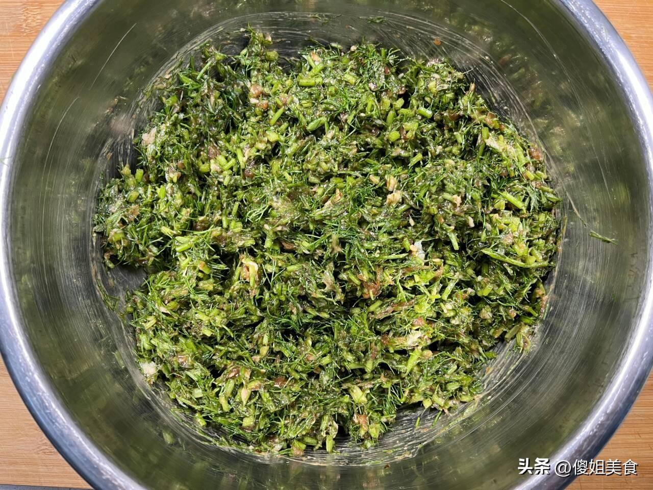 具體做法:1、首先把新鮮的茴香菜擇一下不好的葉子,然後用清水沖洗乾淨後控下水分,最後把茴香菜切成小碎丁,切好的茴香放入大點的容器內,放一勺熟食用油拌均勻,這樣茴香菜既能鎖住水分,還會更翠綠。
