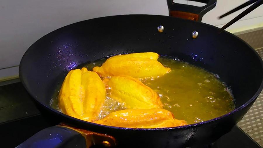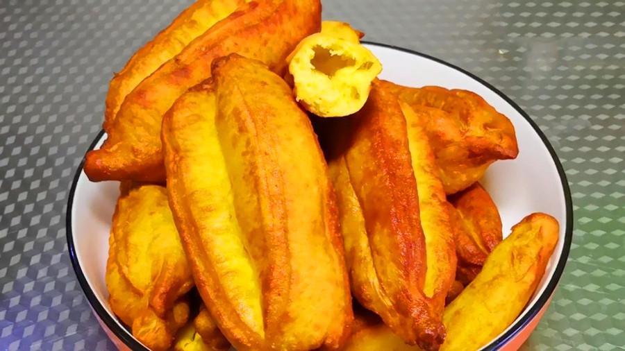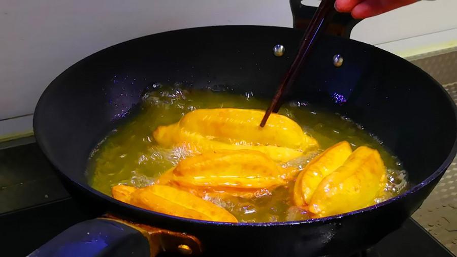 3.起鍋加油,油溫5成熱時下入紅薯油條胚,炸至一面變黃後再翻面炸,炸至油條表面變得金黃,且胖乎乎的、圓鼓鼓的浮起來時,就可以關火出鍋了,美味即成!外酥裏軟的紅薯油條就做好了,喫起來格外香。