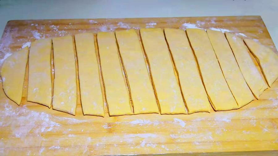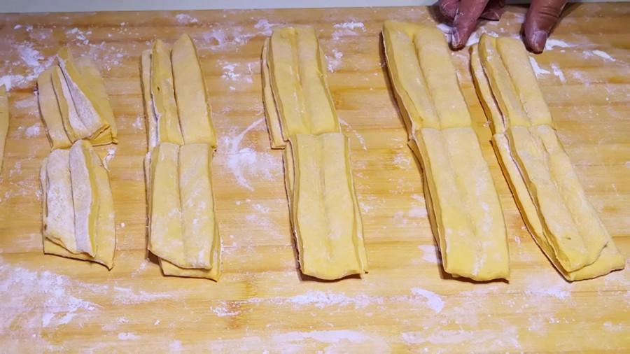 2.面發好後取出,不需要揉搓,直接放到案板上,按扁後擀成長方形的薄餅,再用刀切成條,然後每兩條摞到一起,用筷子從中間豎着壓一下,使它們粘到一起,再把兩頭捏緊了。