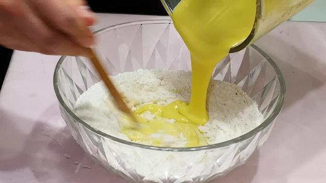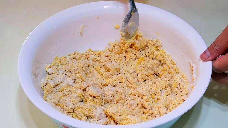 3.250克的紅薯泥中加入250克的麪粉,用筷子順着一方向充分攪拌均勻,再蓋上一層保鮮膜,放到溫暖的地方醒發至兩倍大。