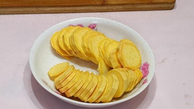 1.紅薯洗淨削皮後,切成薄一點的片裝盤,然後再放入蒸鍋中蒸熟,大約需要15分鐘左右。