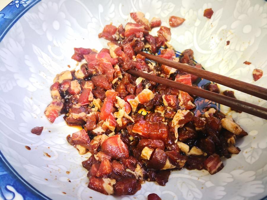 2、準備肉餡:五花肉剁成肉餡,當然也可以切成小丁,剁好的肉餡爲了更好的入味,一定要醃製一下,加入蠔油、生抽、胡椒粉攪拌均勻後醃製20分鐘。再準備一把紅薯粉條,下鍋煮軟後撈出過涼水,然後切細備用。