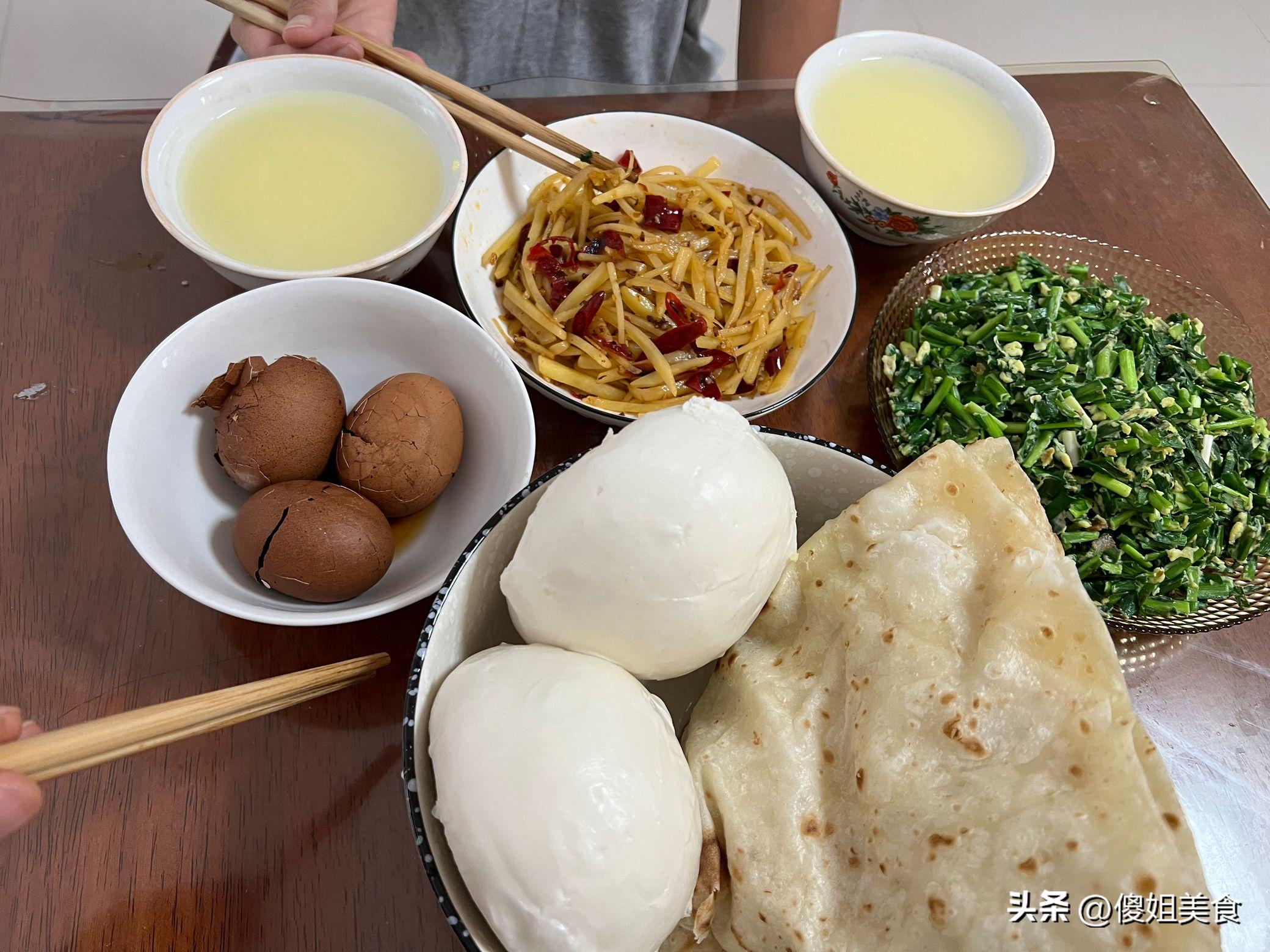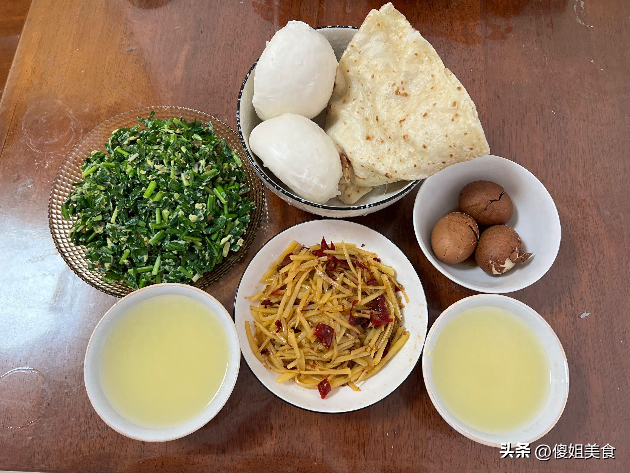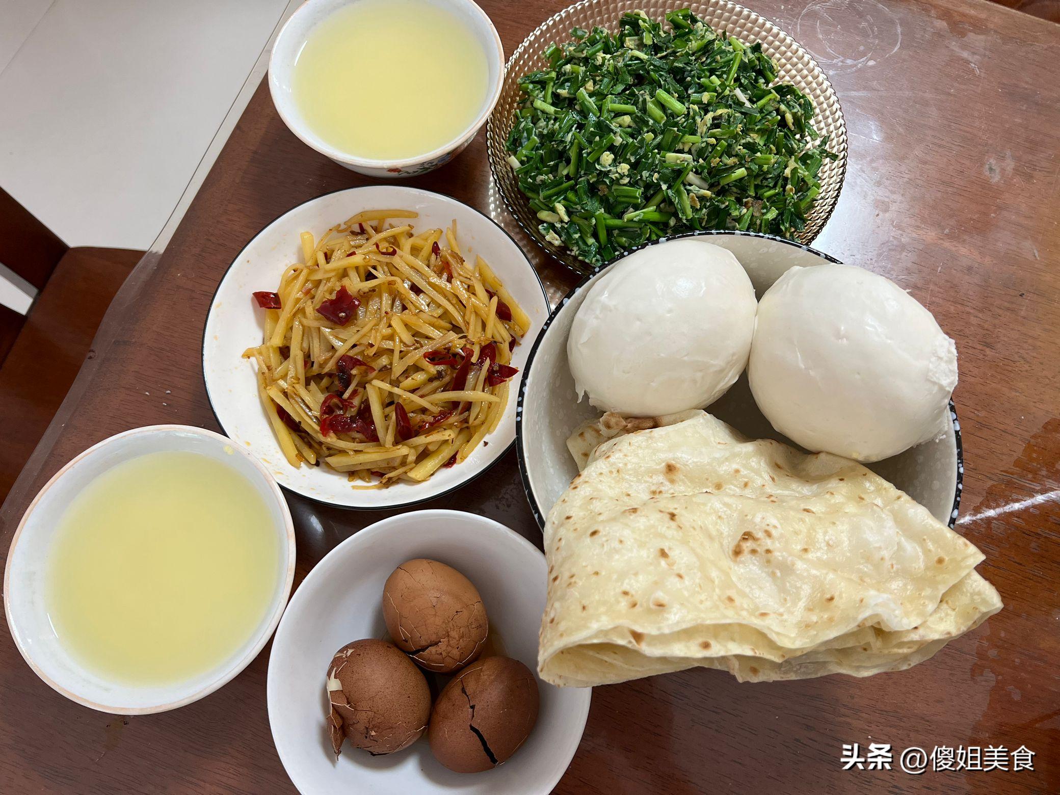 今天的早餐有點特別,秋天的韭菜正是鮮嫩的時候,不能錯過,我特意做了韭菜炒雞蛋,還炒了我們家最愛的土豆絲。主食方面,我早起蒸了幾個饅頭,又順手做了兩張千層餅。再加上小米稀飯和茶葉蛋,營養豐富,色香味俱全。