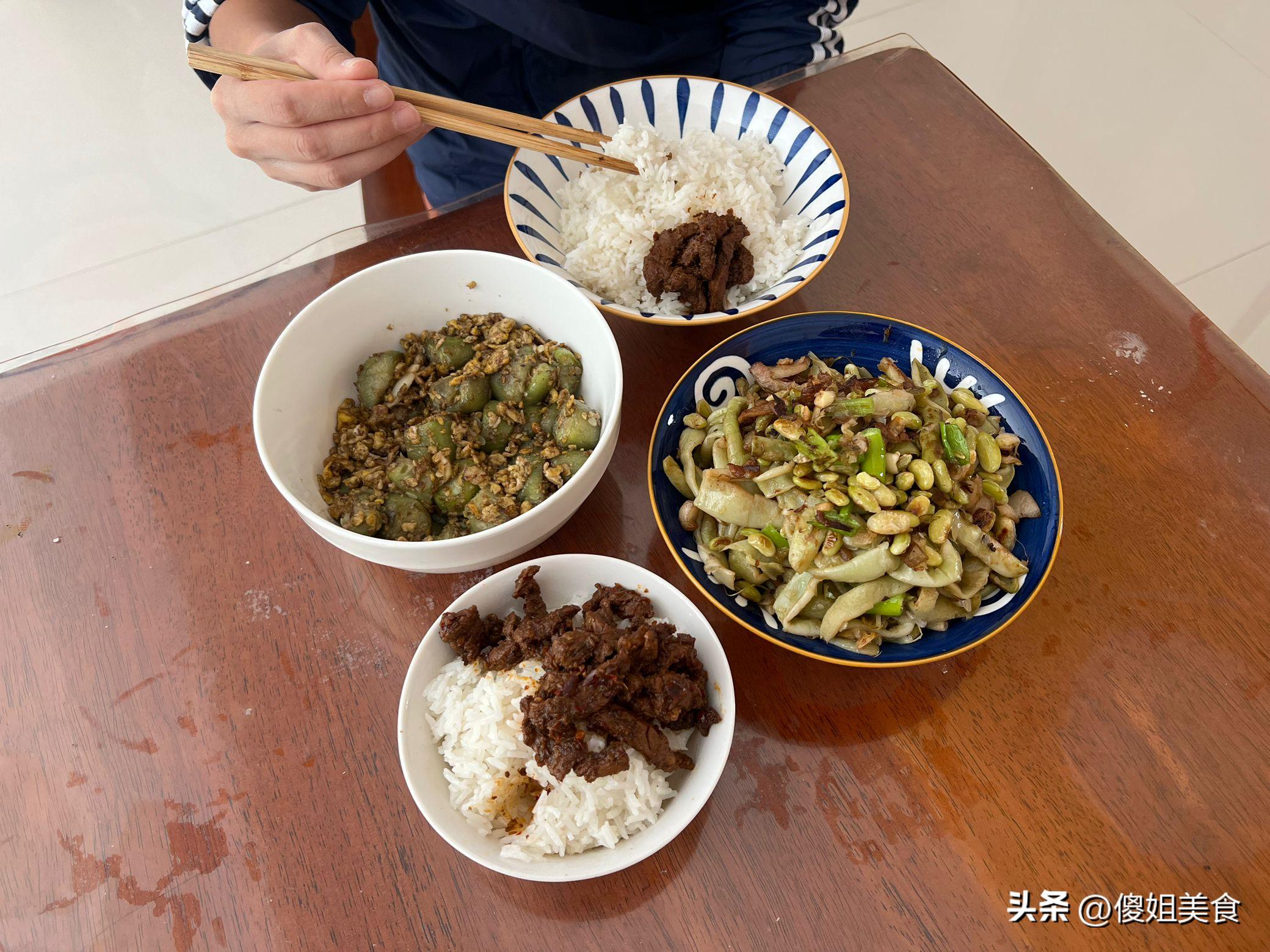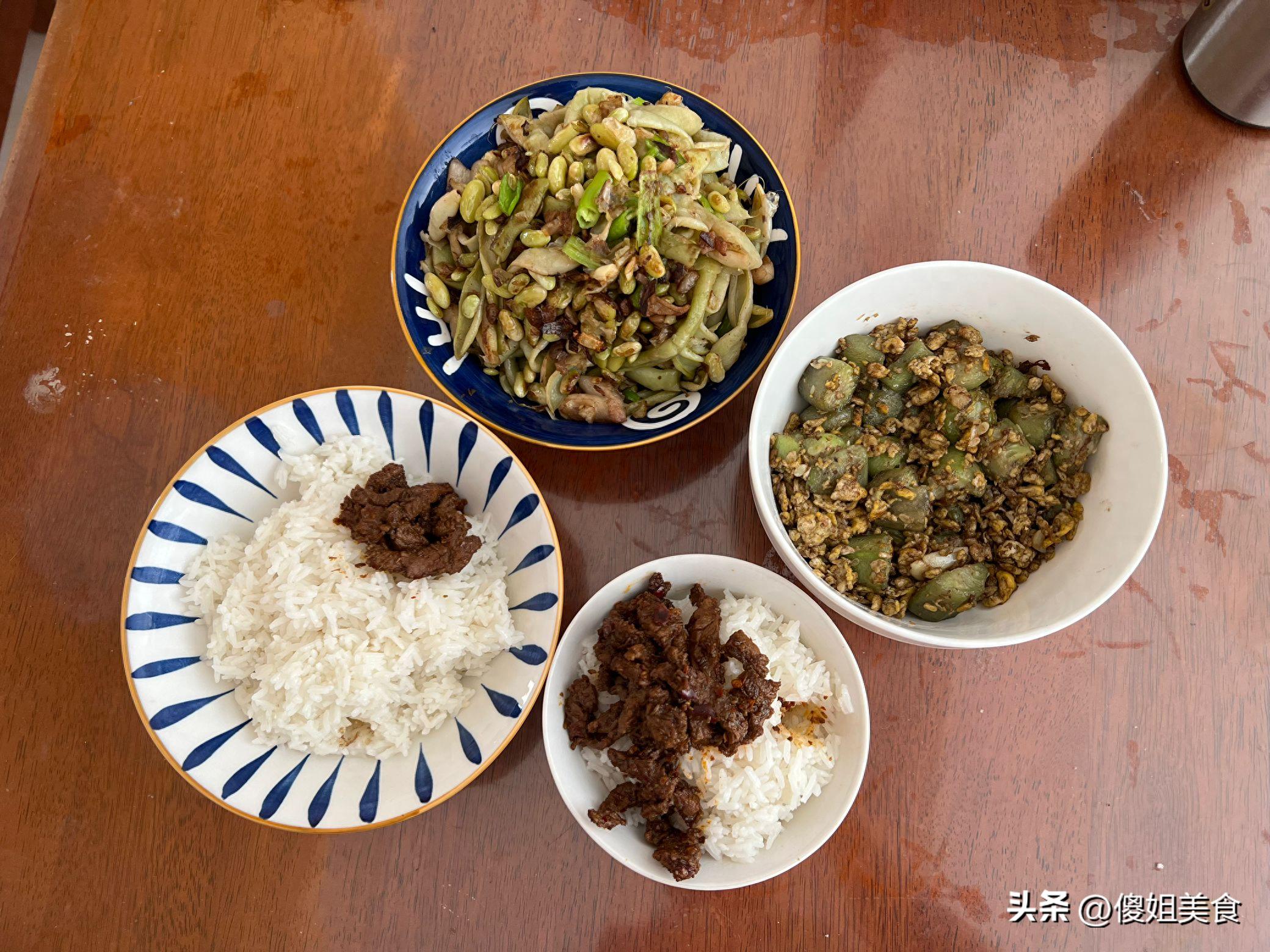 今天的晚餐,我又動手做了兩道簡單的菜。先是自家種的白豆角,這豆角已經掛了不少豆子,我還特意加了兩顆小辣椒提味,最後炒出來香辣適口。接着是炒絲瓜,也是從院子裏現摘的,秋天絲瓜長得特別好,嫩嫩的、綠綠的,看着就覺得清爽。除了這兩道菜,我還給老公做了一份孜然牛肉,畢竟肉類可以補充蛋白質,尤其是我們這個年紀,更需要營養均衡。最後,我還蒸了一鍋米飯,搭配這些菜,簡單卻又充滿滿足感。