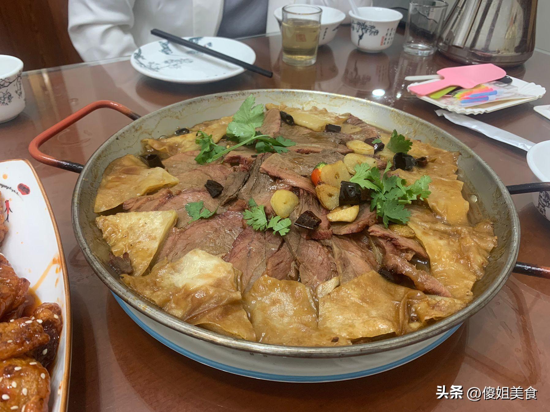 這個燉牛肉是婆婆媽專門爲二姐點的,婆婆媽說二姐打小就喜歡喫牛肉,自己帶着孩子條件不好也很少喫牛肉。牛肉是燉好的,上面還有一層的小餅,蘸着湯汁喫很好喫,別看這麼一大盤,就是上面一層的牛肉,底下都是洋蔥。