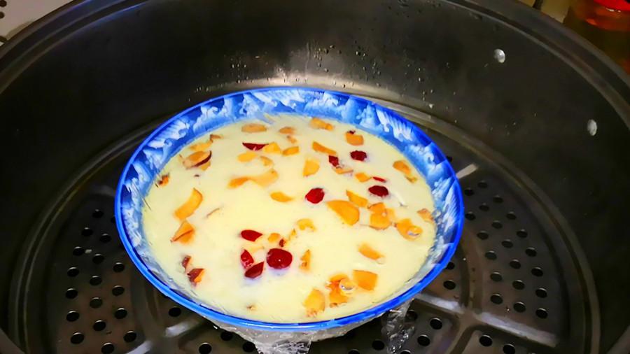山藥去皮後切成小塊,放入料理機中,然後磕入2個雞蛋,將其打成山藥液;取一個小碗,先在碗底刷一層食用油,防止沾碗,然後倒入打好的山藥雞蛋液,把上面的浮沫撇去以後,再在上面撒上一層紅棗碎,然後蓋上一層防高溫的保鮮膜,在保鮮膜上紮上幾個小孔,方便透氣。然後放入蒸鍋中將其蒸熟即可。