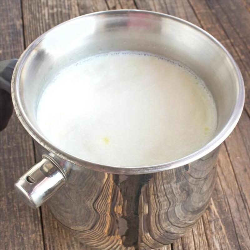5、把內酯倒入一個大點的乾淨的鍋子裏,用少許溫水化開,等豆漿晾涼至85度之後,將其拿起來,高一點衝入到盛有內酯的鍋子裏,不需要攪拌,把上面的浮沫撇出來以後,蓋上蓋子靜置20分鐘,豆腐腦就做好了,掀開蓋子看一下,已經定型啦。