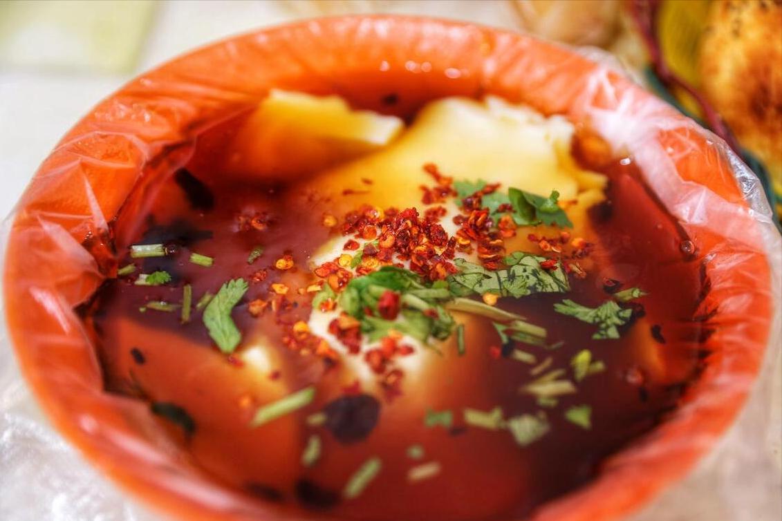 6、如果是南方朋友,應該喜歡放白糖的,直接舀出來,加上白糖即可開喫。如果是像我一樣的北方人,那就得做個滷子了。鍋內加水燒開,放入木耳丁、生抽、老抽、鹽、白糖、花椒麪,煮沸後淋入水澱粉,然後舀在豆腐腦中,最後來點榨菜丁、香菜、辣椒油,開喫!