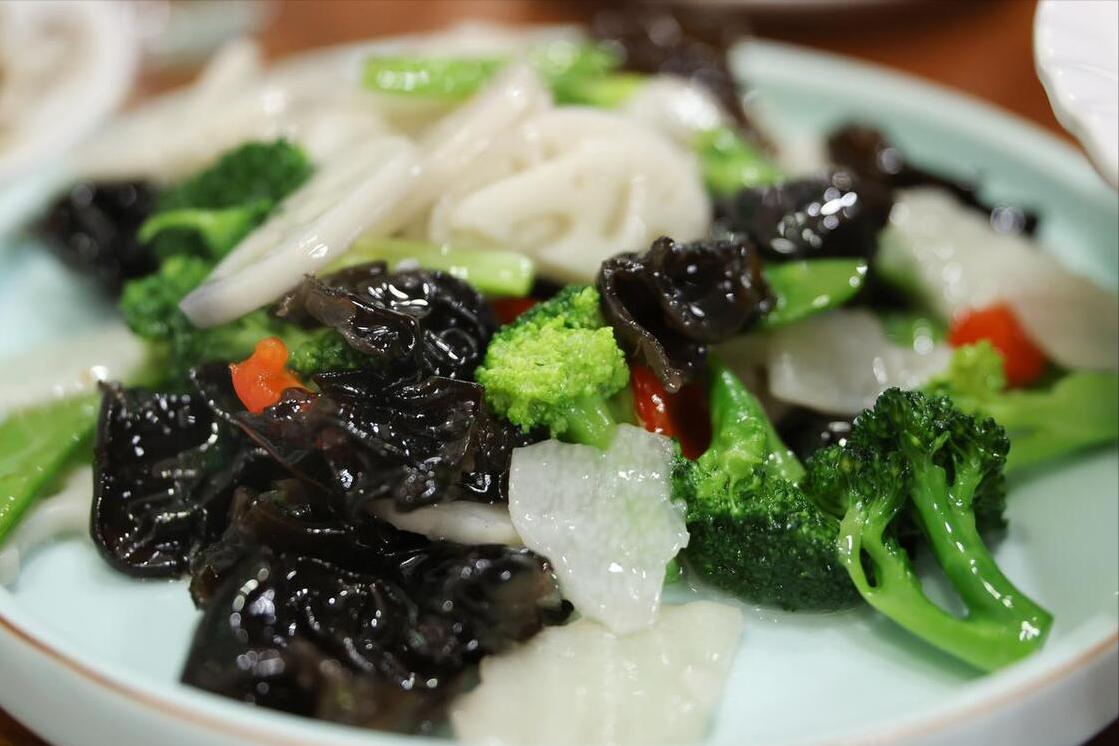 材料:山藥、西蘭花、蝦仁、木耳、大蒜、生抽、蠔油、鹽、白糖、雞精、白胡椒粉