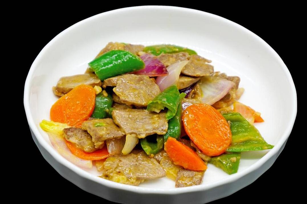 2、鍋子裏倒油,倒入豬肝爆香後,盛出來備用。接下來把蔥薑蒜、洋蔥、青紅辣椒倒進去,炒出香味之後,重新倒入豬肝,然後用鹽、雞精、生抽、蠔油、老抽調味後,盛出來開喫!